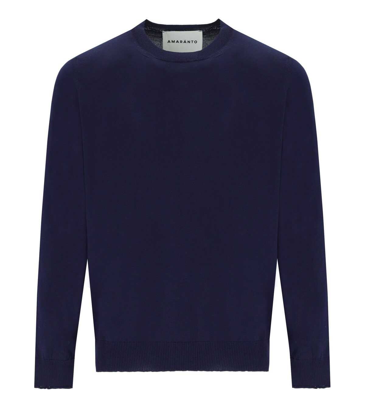 Amaranto jumper made of lightweight navy blue cotton yarn, with ribbed neckline, cuffs, and hem. Contrast embroidery on the side. Soft fit.