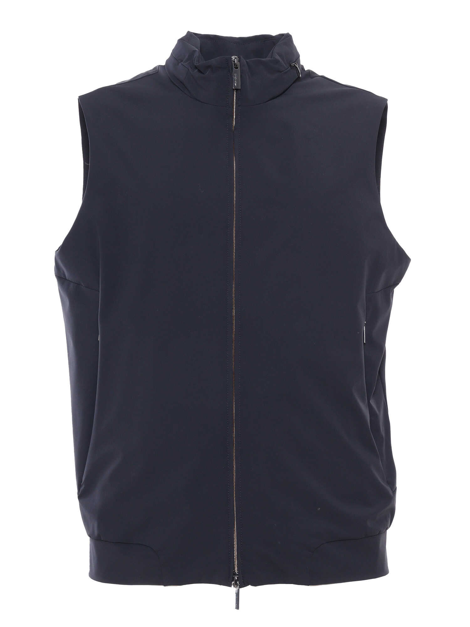 RRD men's blue vest in polyurethane without hood, high collar, slanted welt pockets.