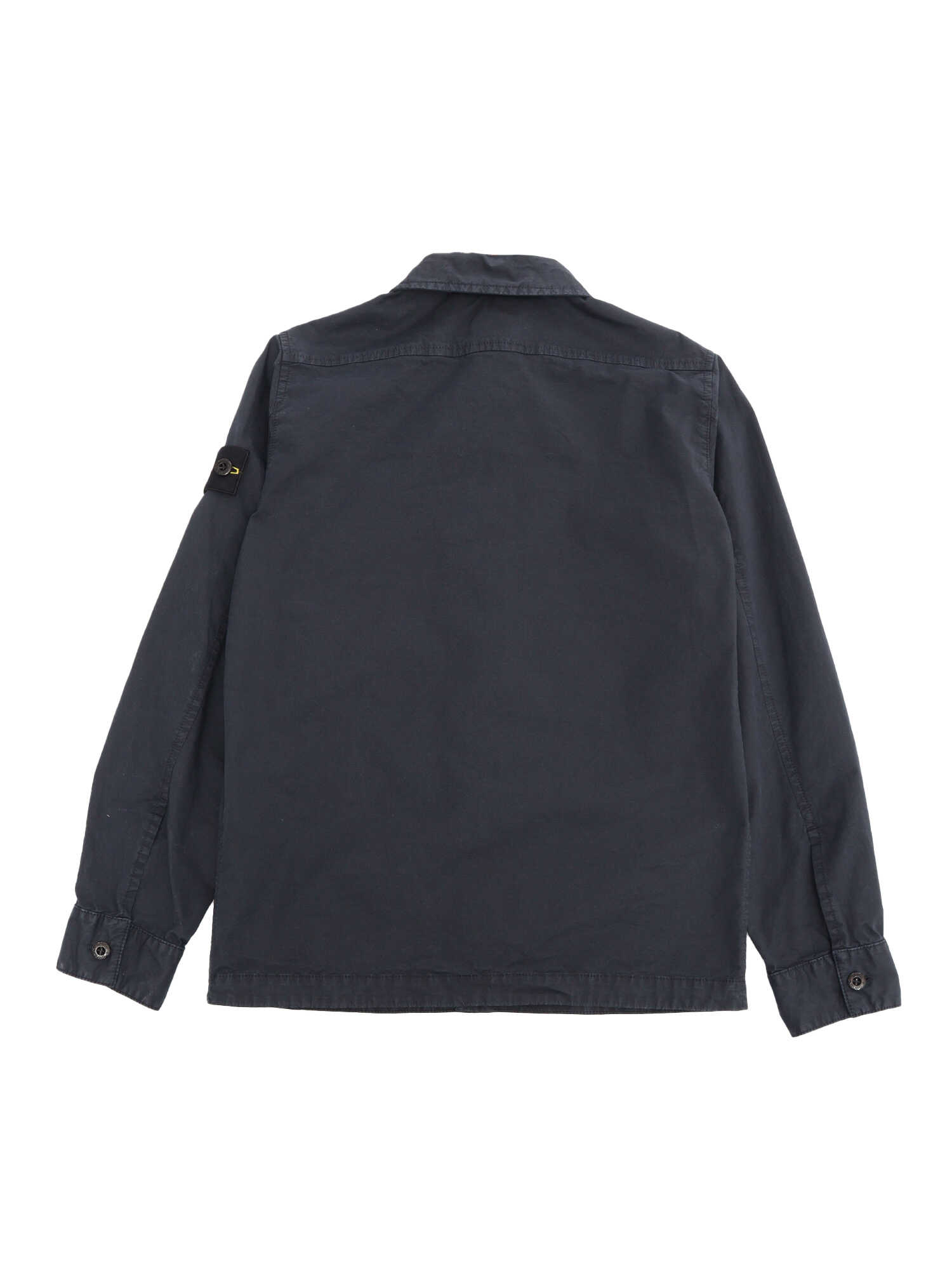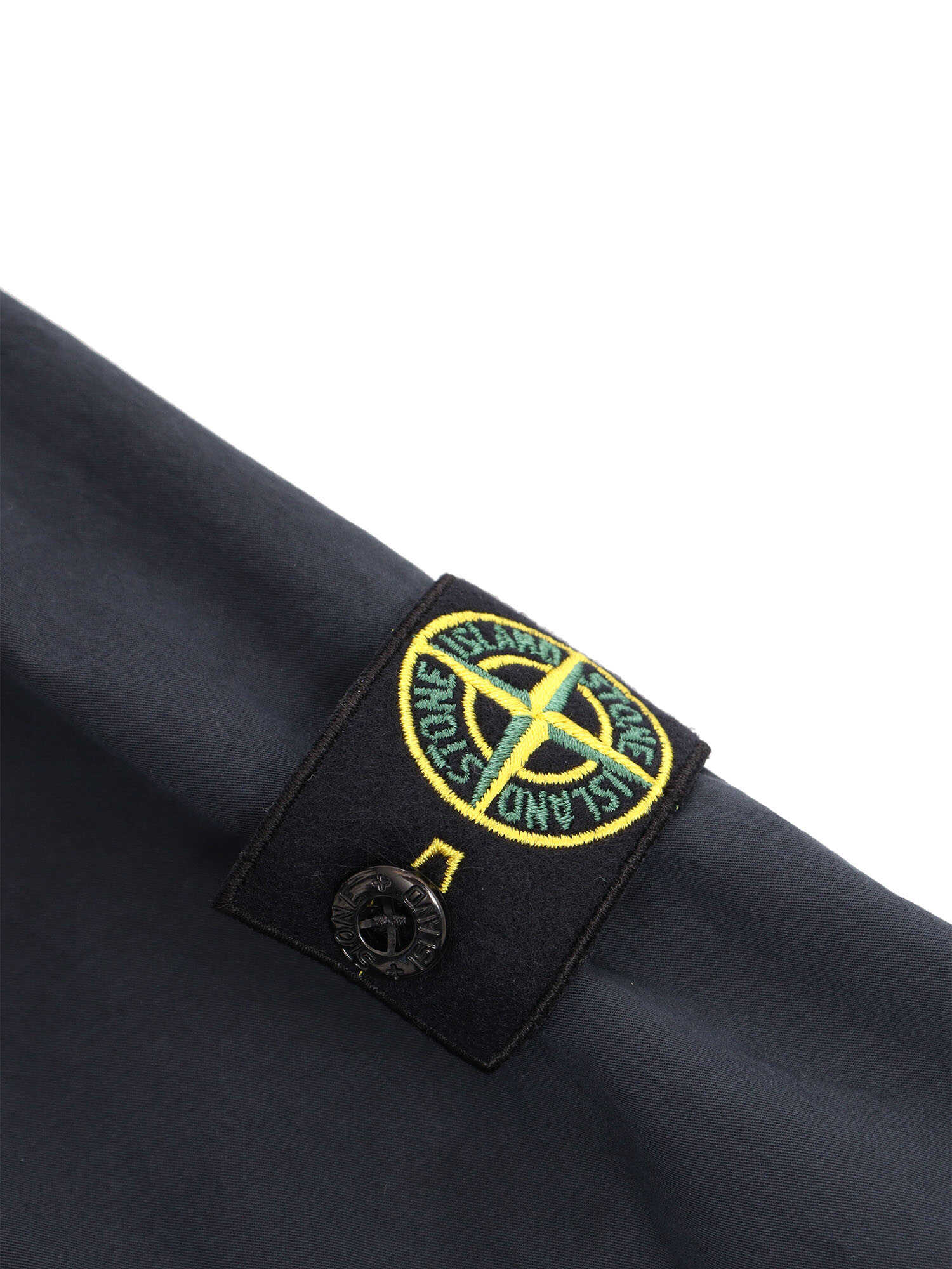 Black denim jacket with large pockets on the front and logo plate on the sleeve.