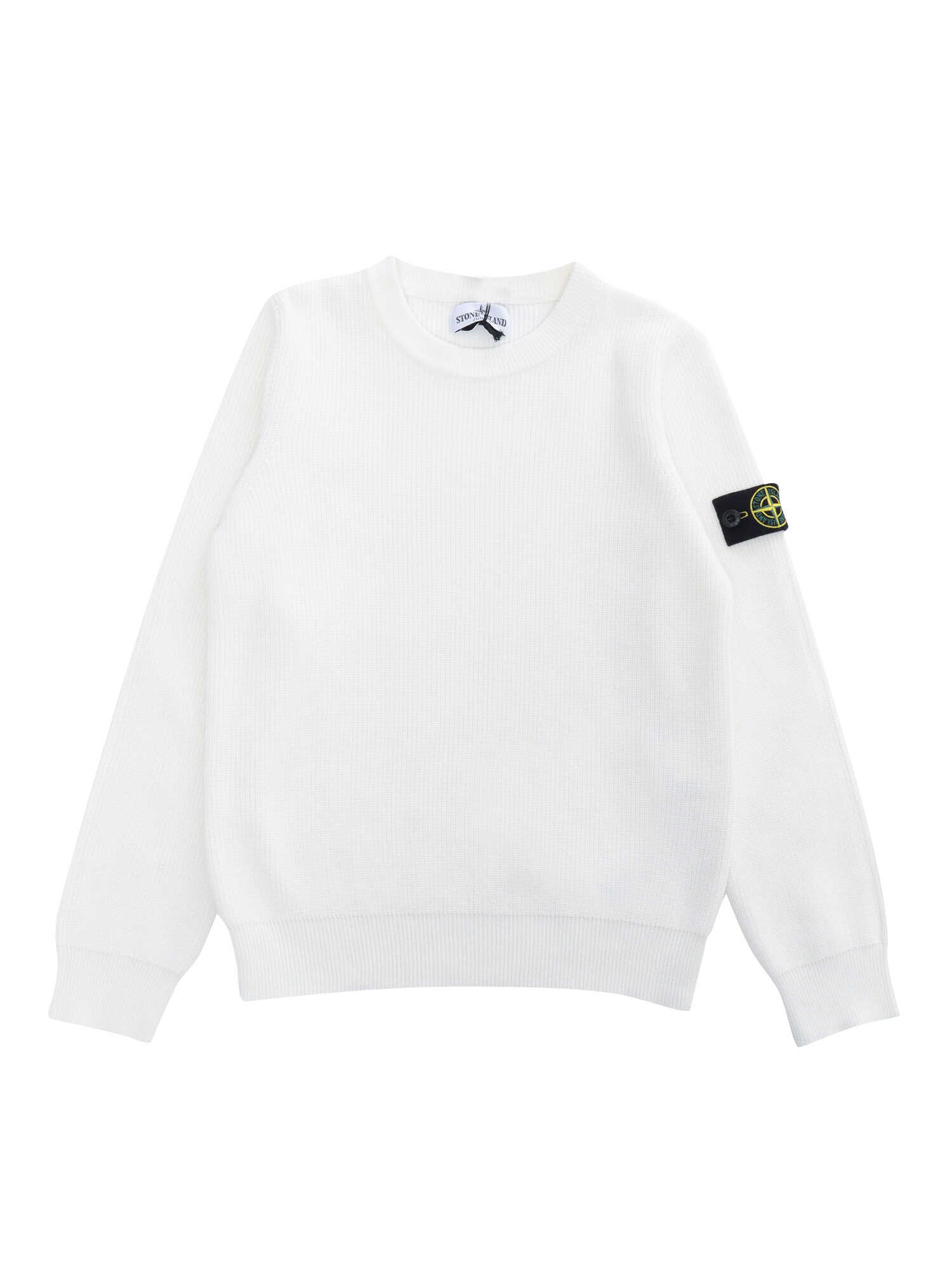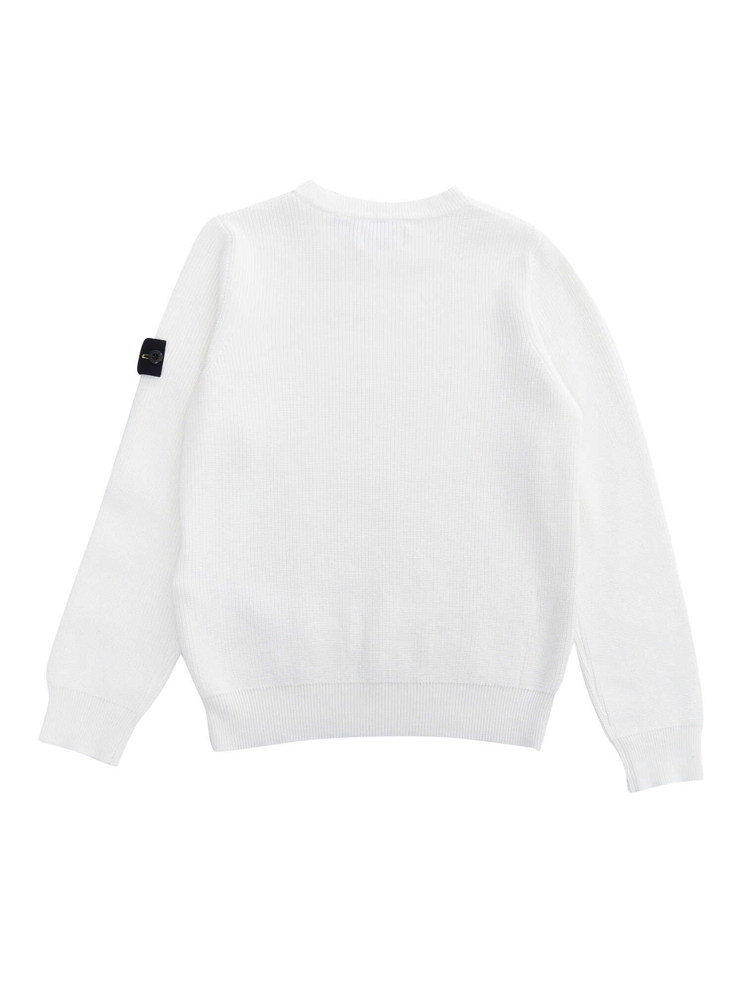 White ribbed crew-neck sweater with contrasting logo plate on the sleeve.