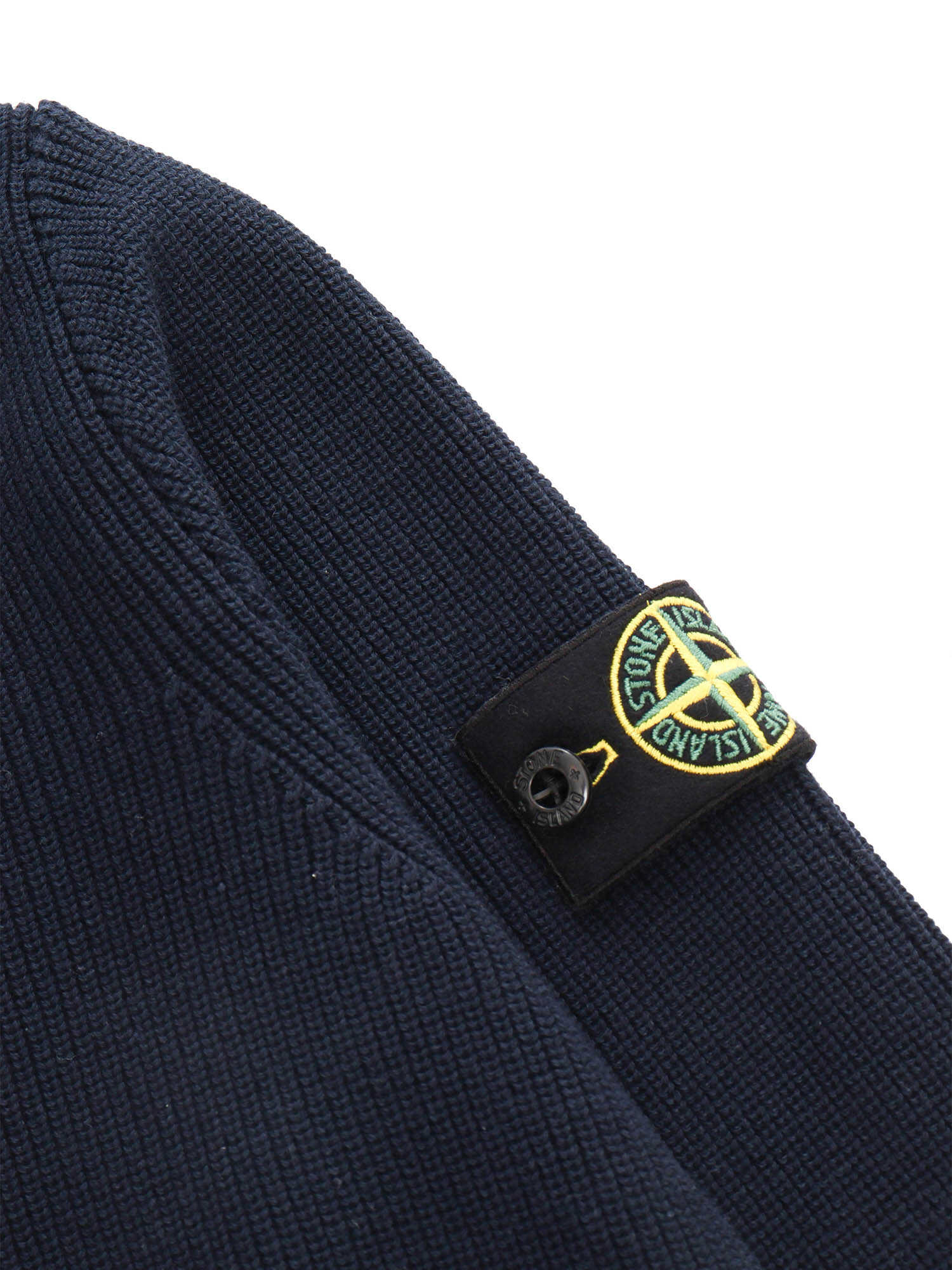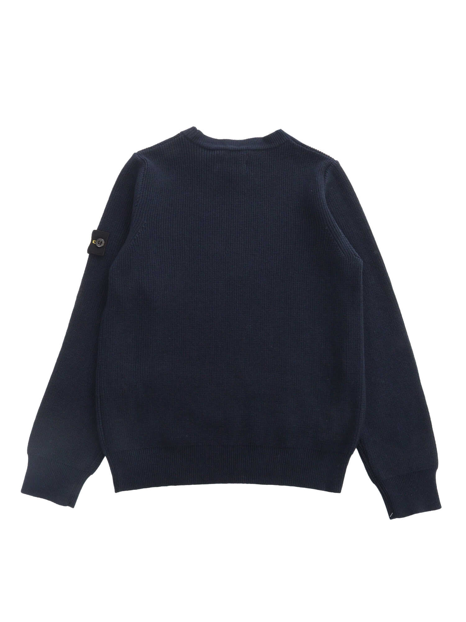Black ribbed crew-neck sweater with contrasting logo plate on the sleeve.