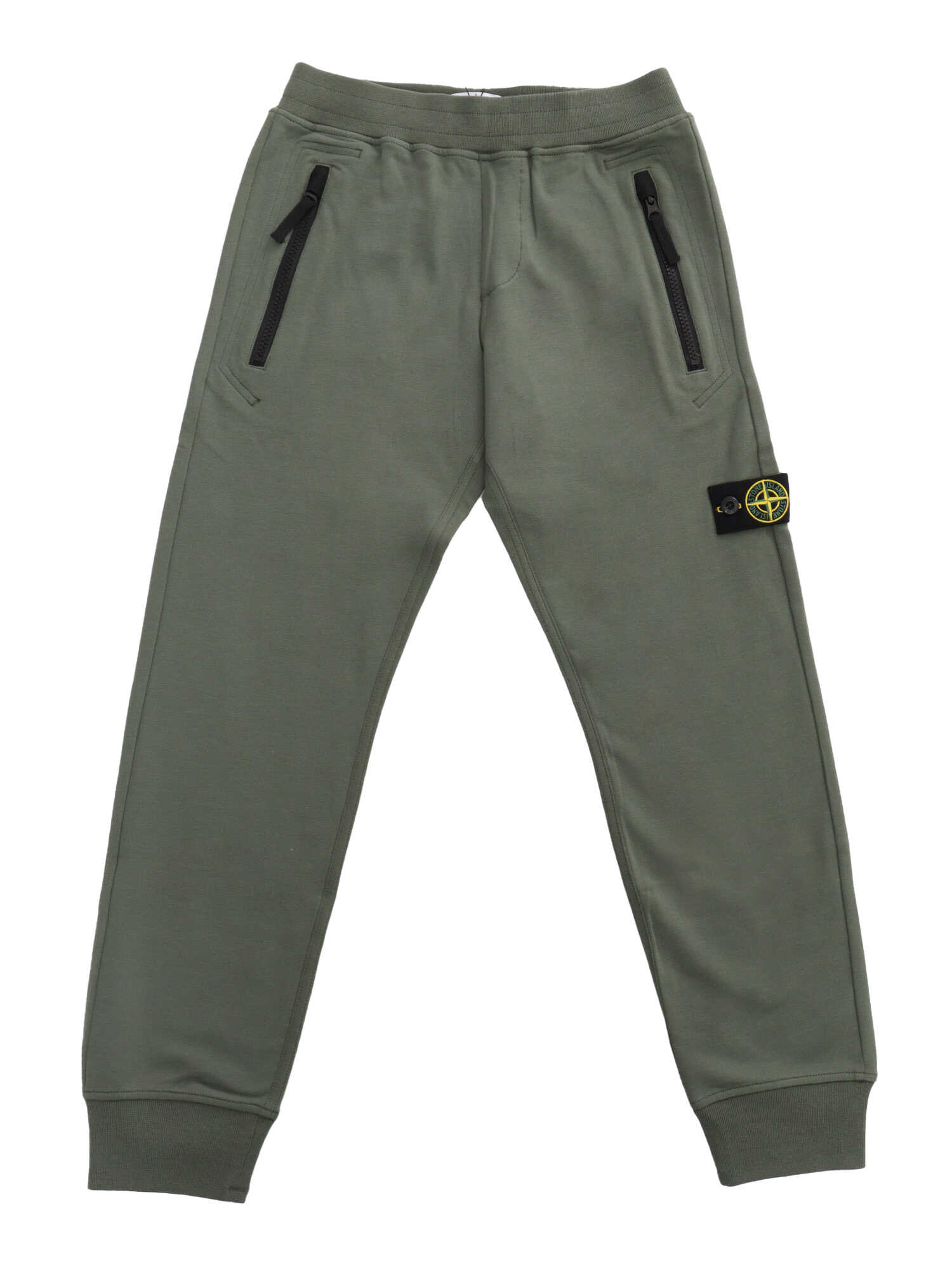 Military green fleece jogging trousers with slanted zip pockets and contrasting logo plate.
