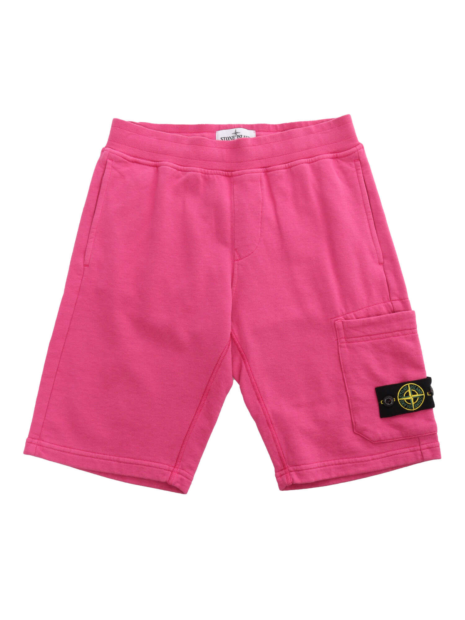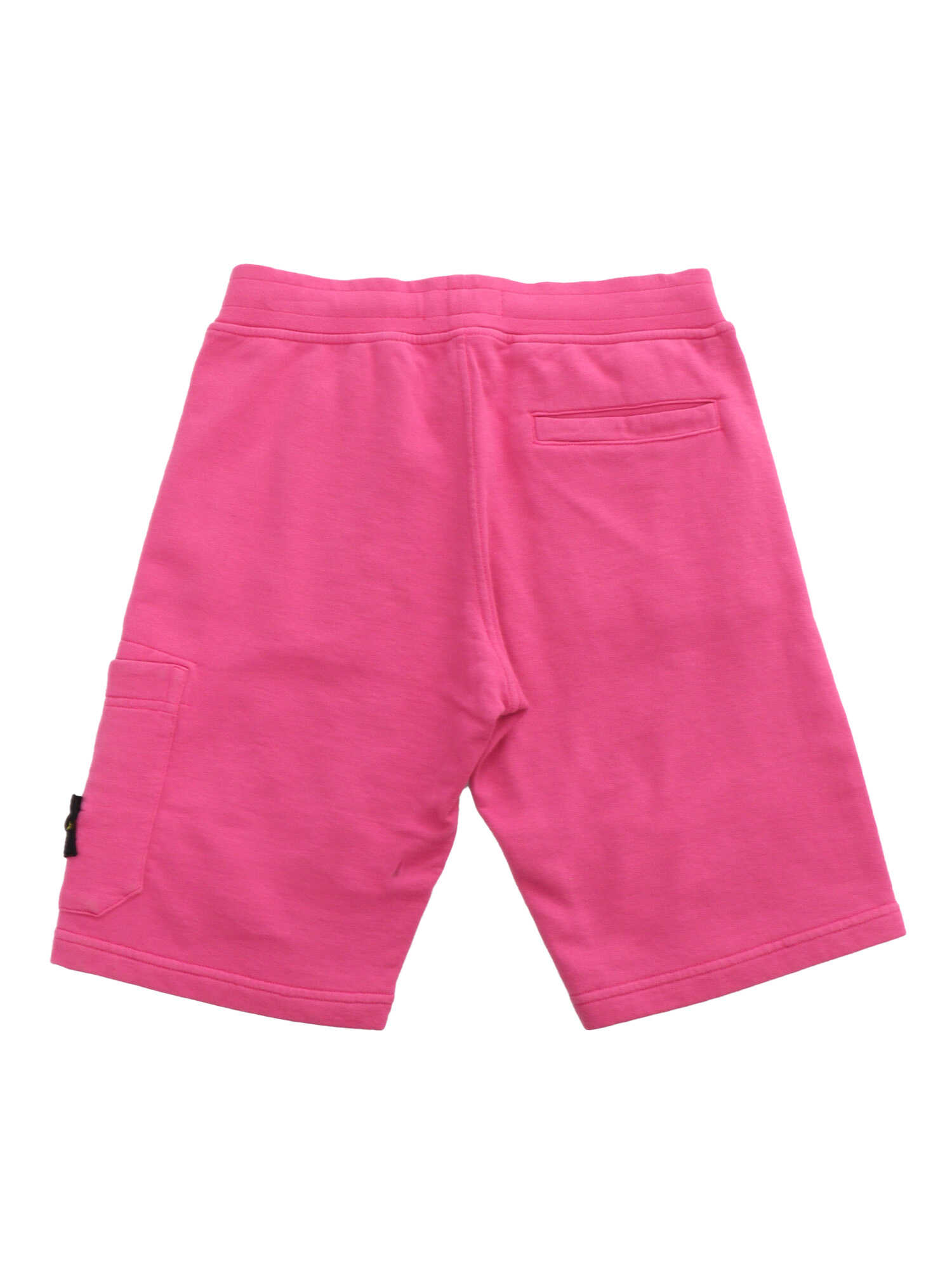 Pink cotton fleece Bermuda shorts with front pocket and contrasting logo plate.