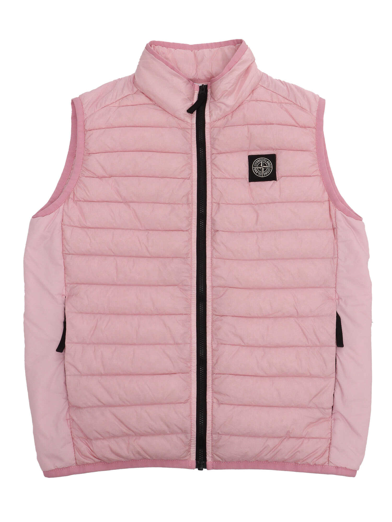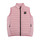 Pink padded vest with contrasting front zip, logo plate on the front, welt pockets with zip.