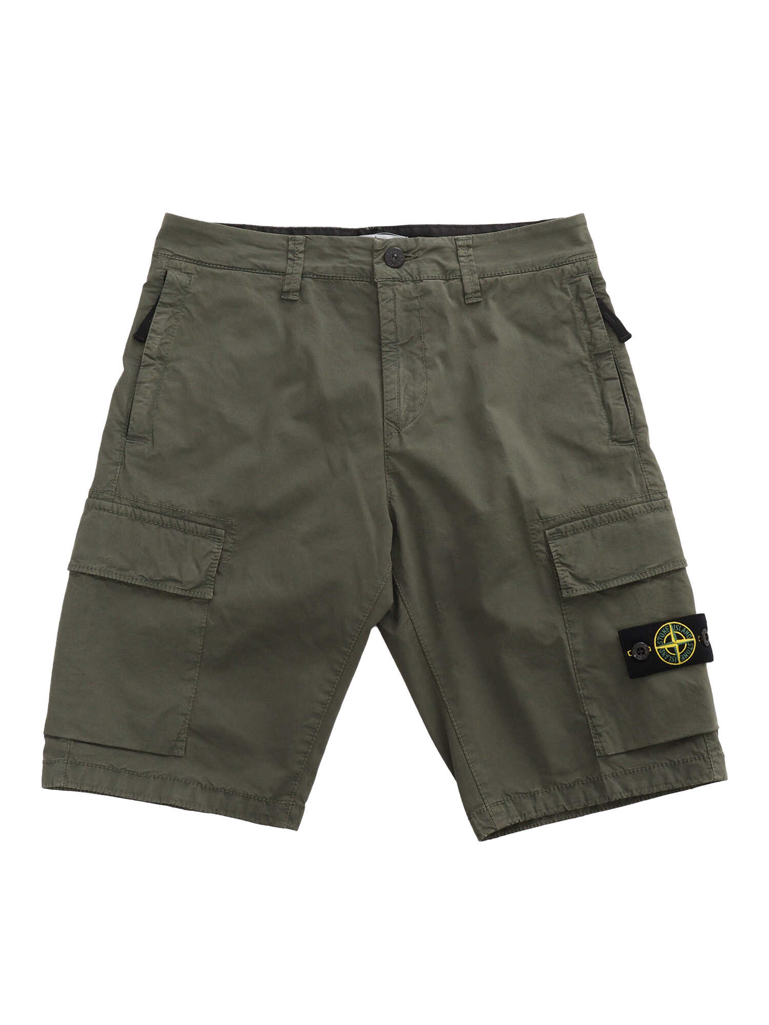 Military green Bermuda shorts in stretch cotton with patch pockets on the sides and contrasting logo label.