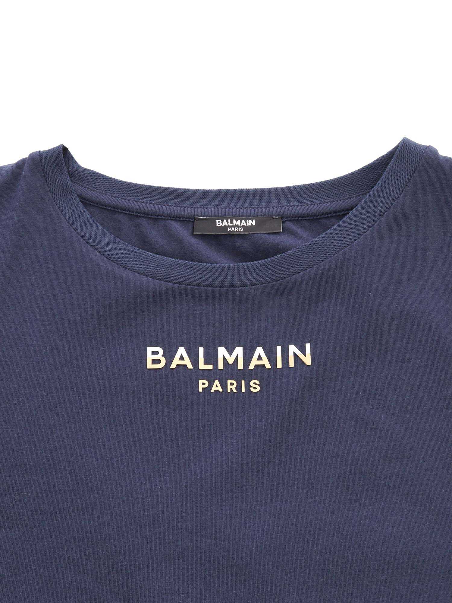 Blue stretch cotton t-shirt for girls with contrasting Balmain logo on the front.
