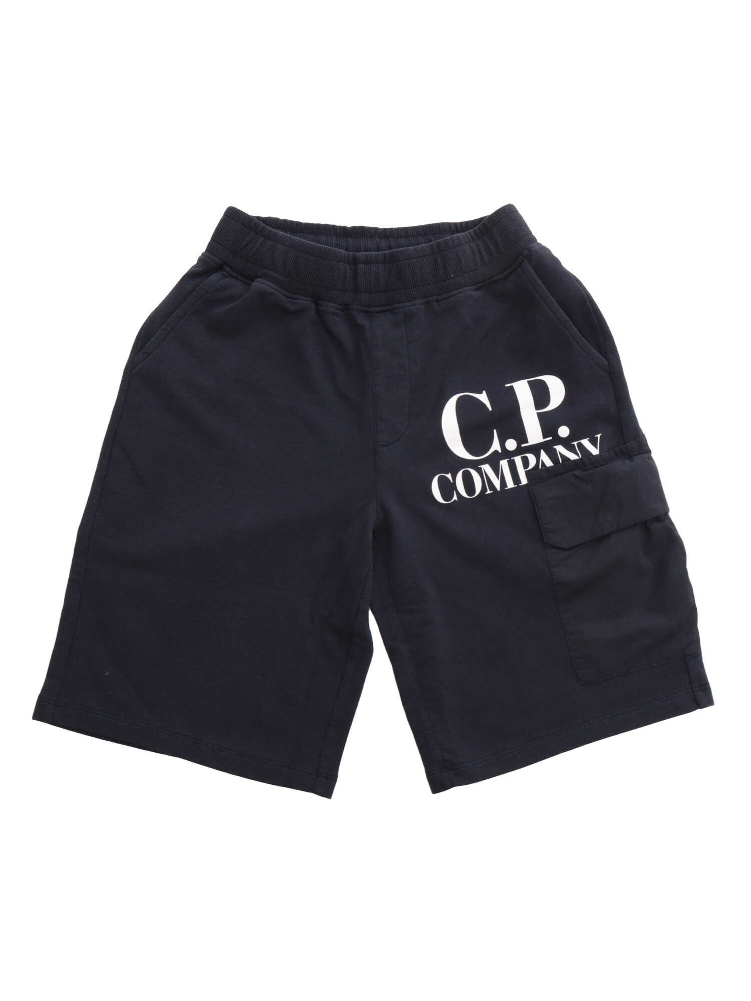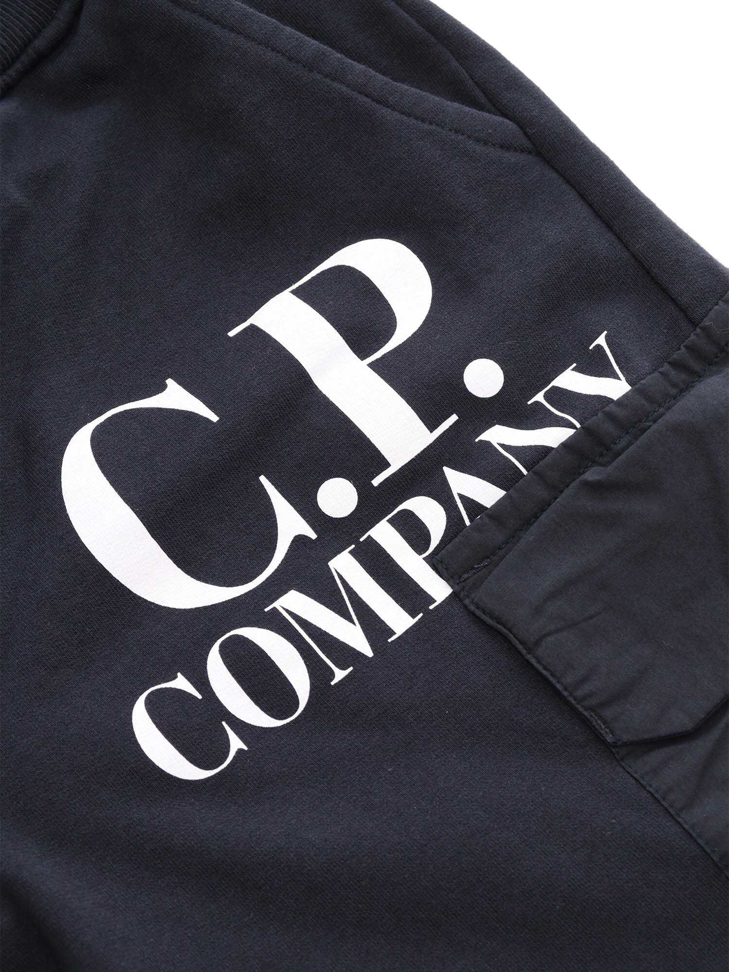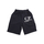 Gray sweatshirt shorts with contrasting white logo and patch pocket on the front.