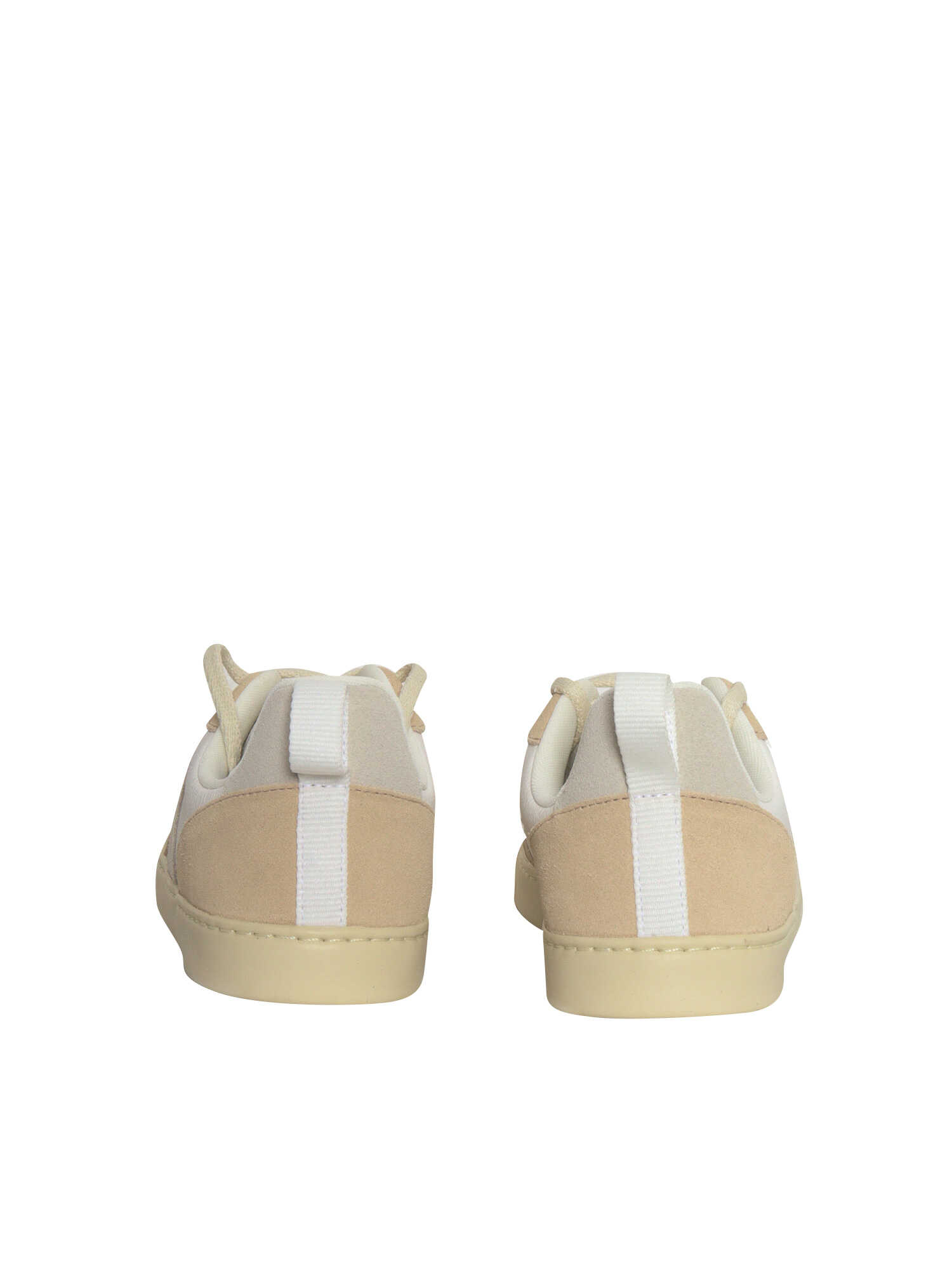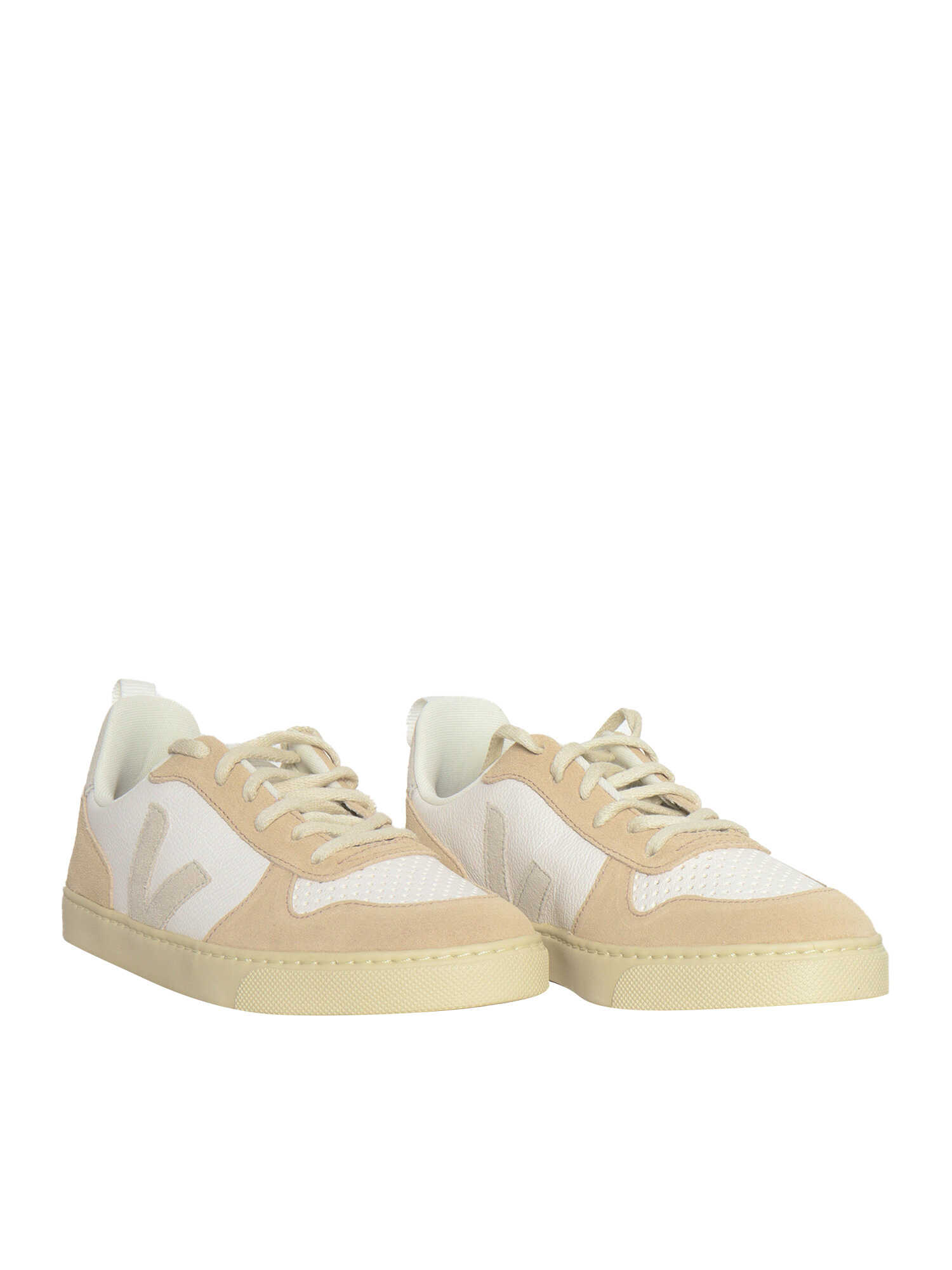 White v-10 Veja children's sneakers with beige suede inserts, side logo, reinforced heel, tongue to make it easier to put on.