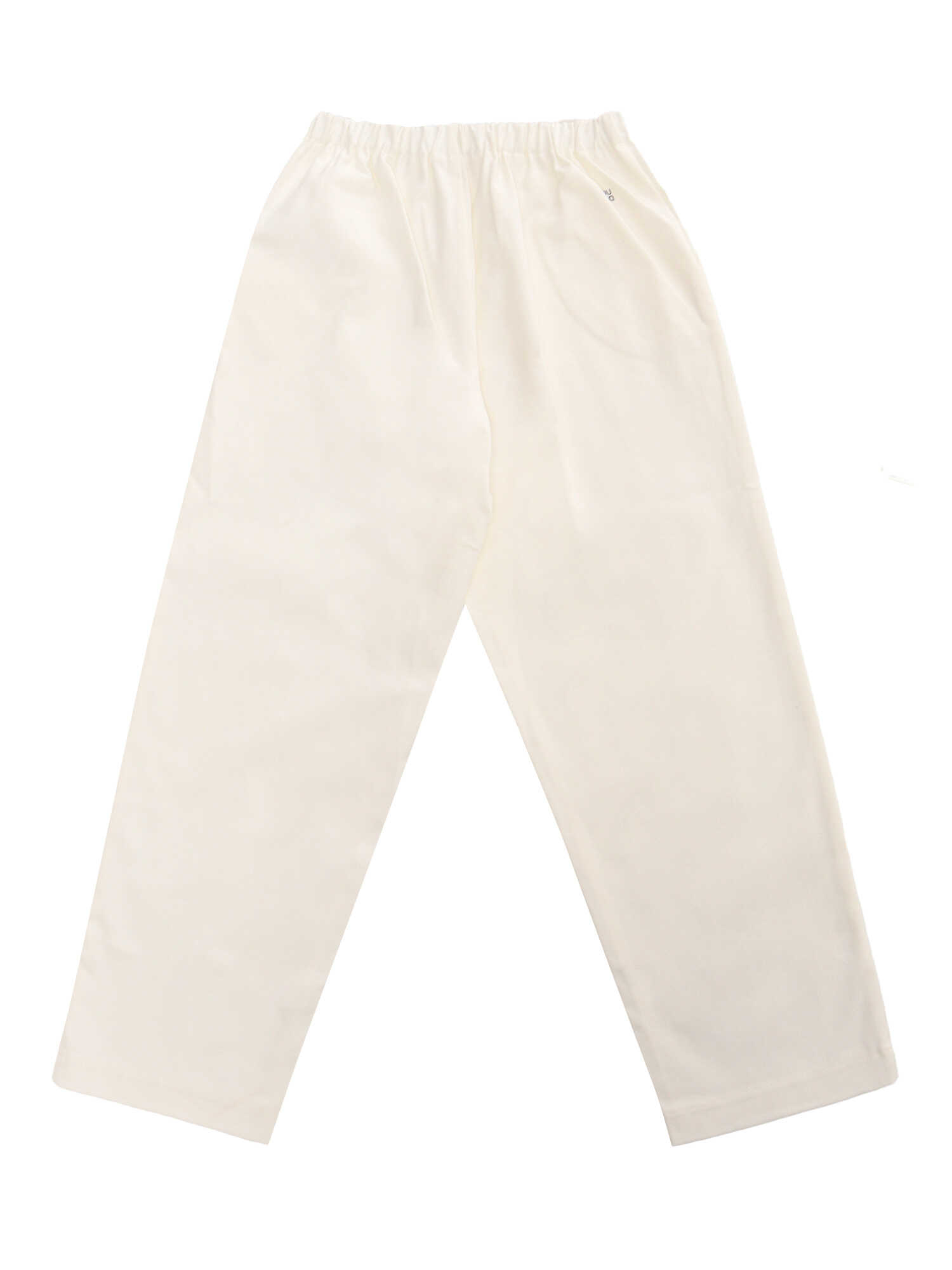 Cream-colored stretch cotton straight-leg trousers for children with elastic waistband and welt pockets.