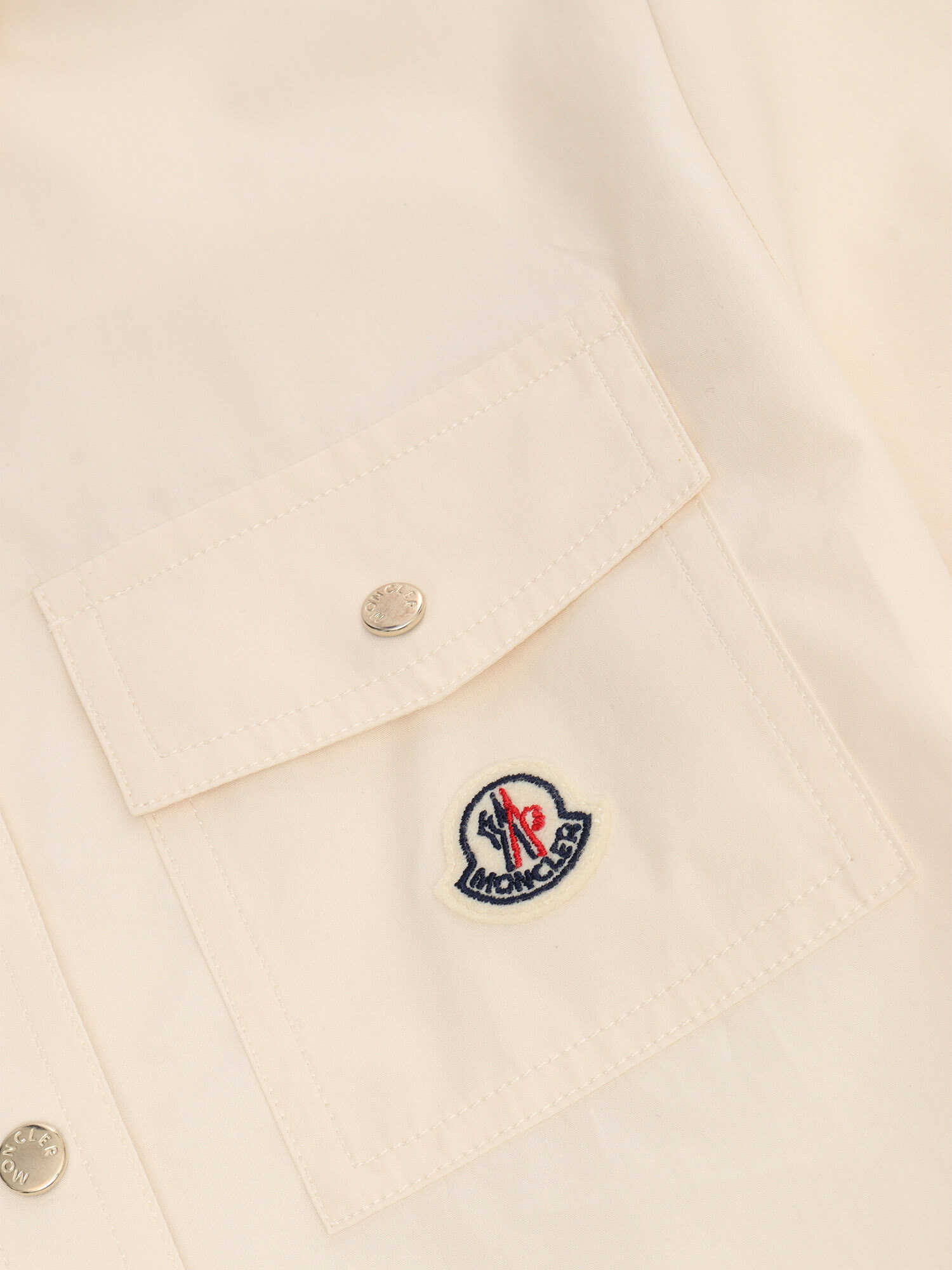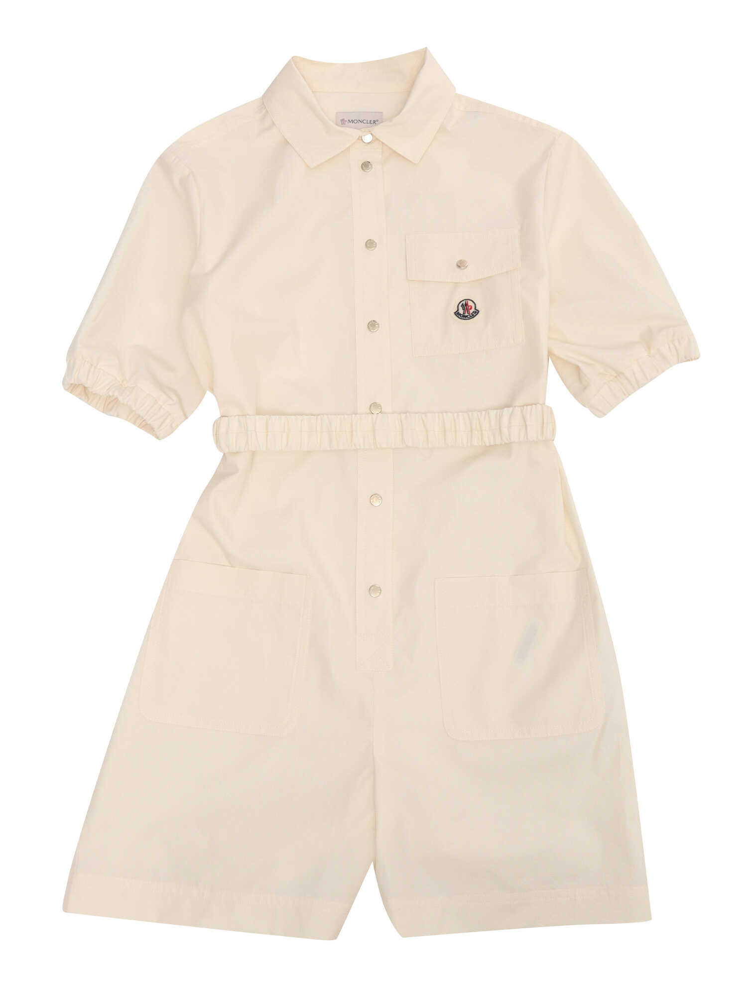 Cream Moncler baby girl's polo-style playsuit with short sleeves, patch pocket with logo on the front, elastic band at the waist.