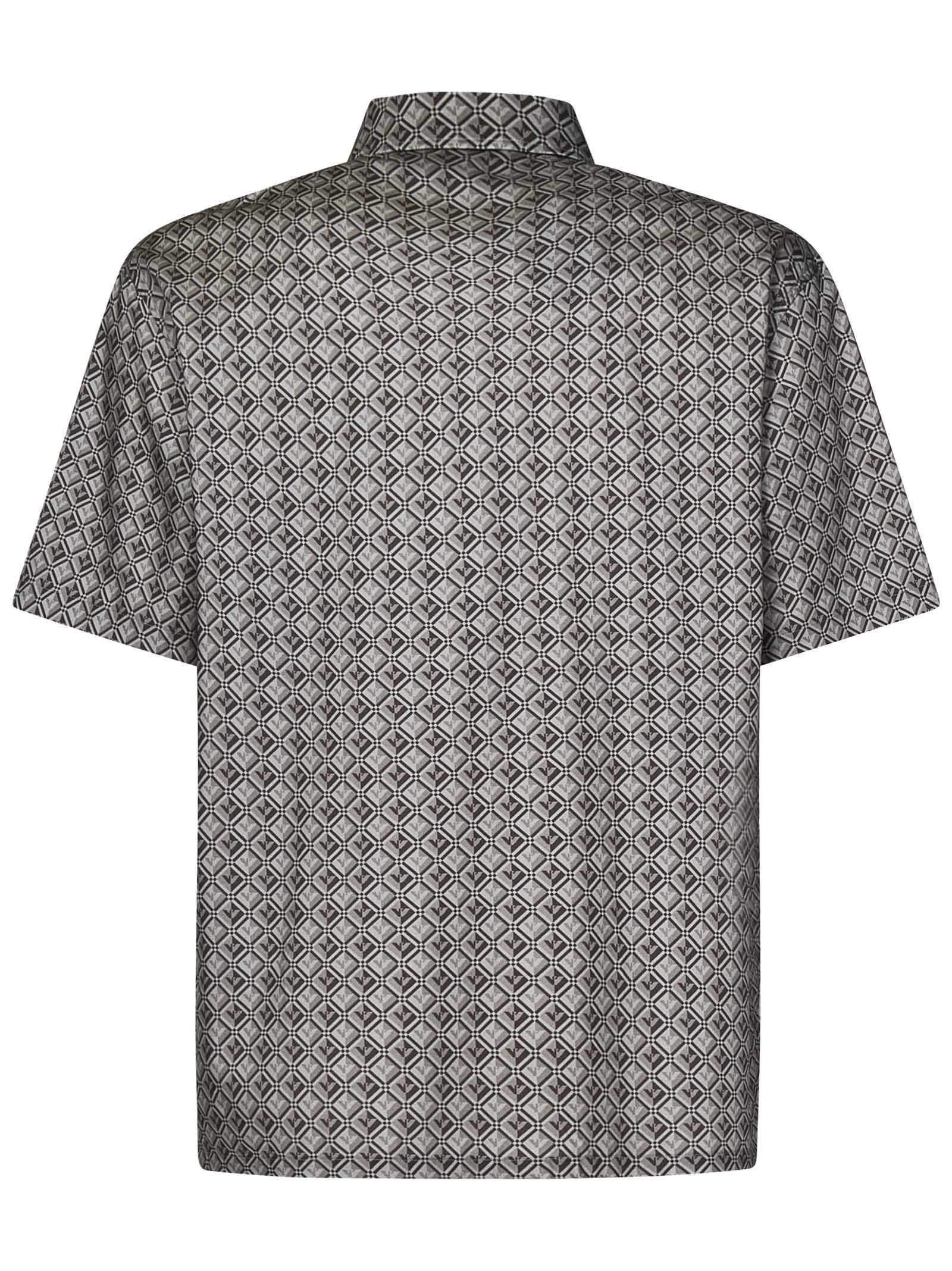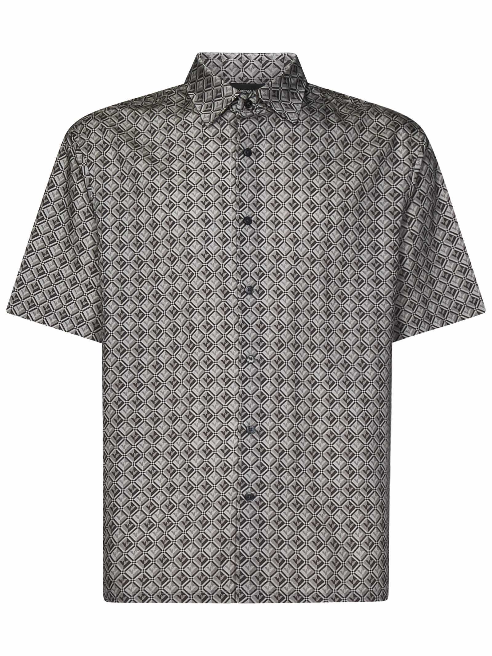 Gray short-sleeved shirt in lyocell and cotton with eagle and all-over geometric pattern.