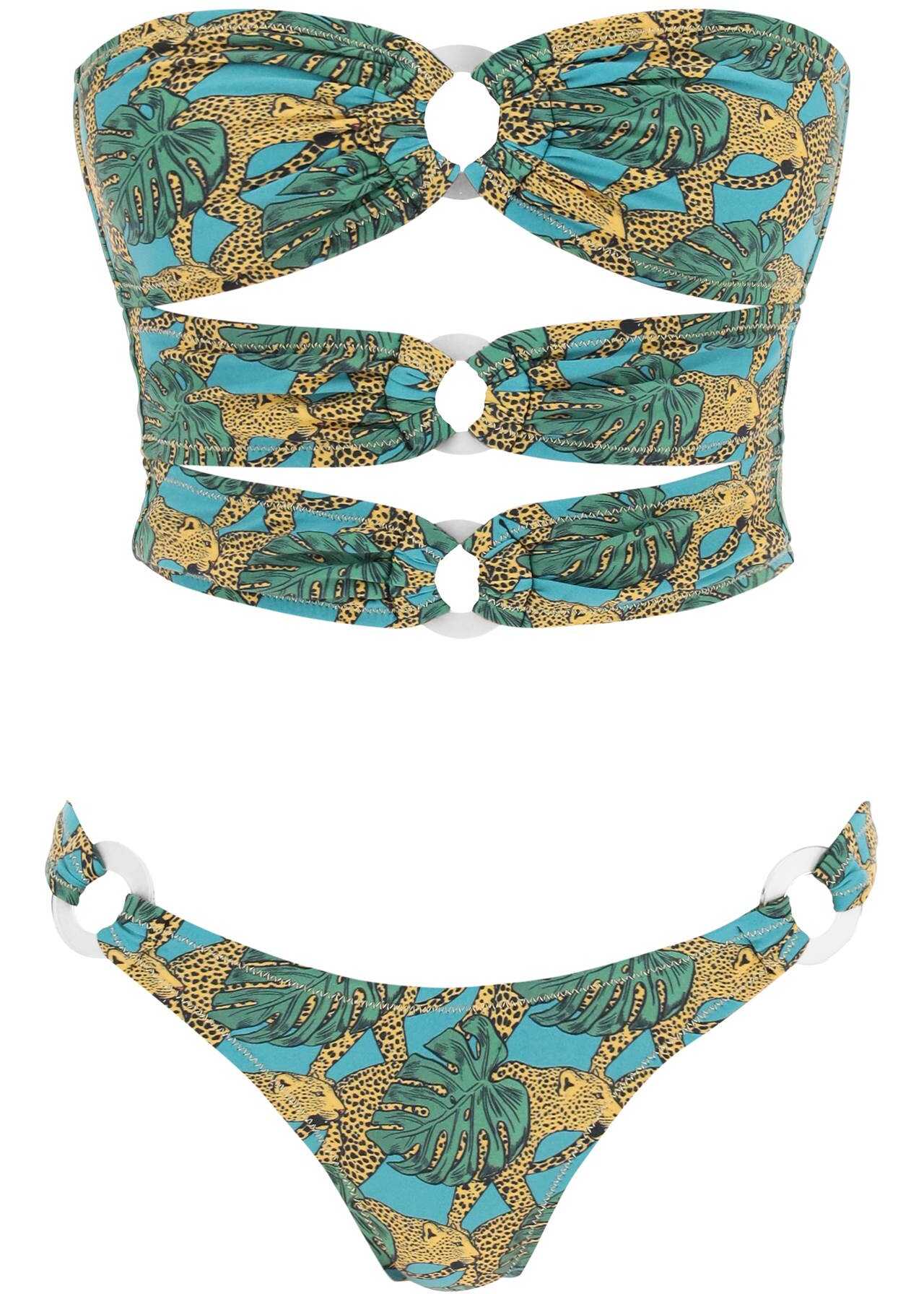 The Cage bikini set by Reina Olga is made of regenerated nylon Lycra ECONYL® , featuring a top with a cut out design and structured side seams, and low-rise bottoms adorned with decorative plexi rings. The model is 177 cm tall and wears a size 1.