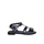 Blue laminated calfskin sandal with bow and mirrored medusa logo on the front, adjustable strap with rhinestones.