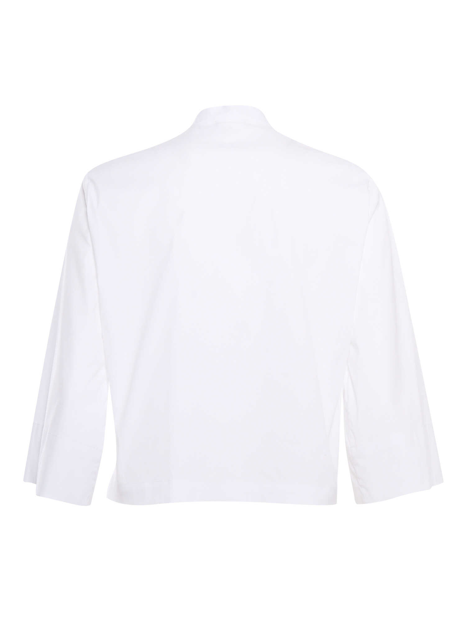 Olimpia white cropped shirt in stretch cotton blend, bell sleeves, mandarin collar, front buttons.