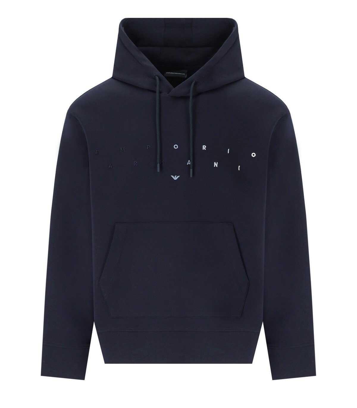Emporio Armani hoodie made of blue stretch cotton blend fabric. Adjustable hood with drawstring, front pocket, and embroidered logo on the front with a gradation effect. Regular fit.