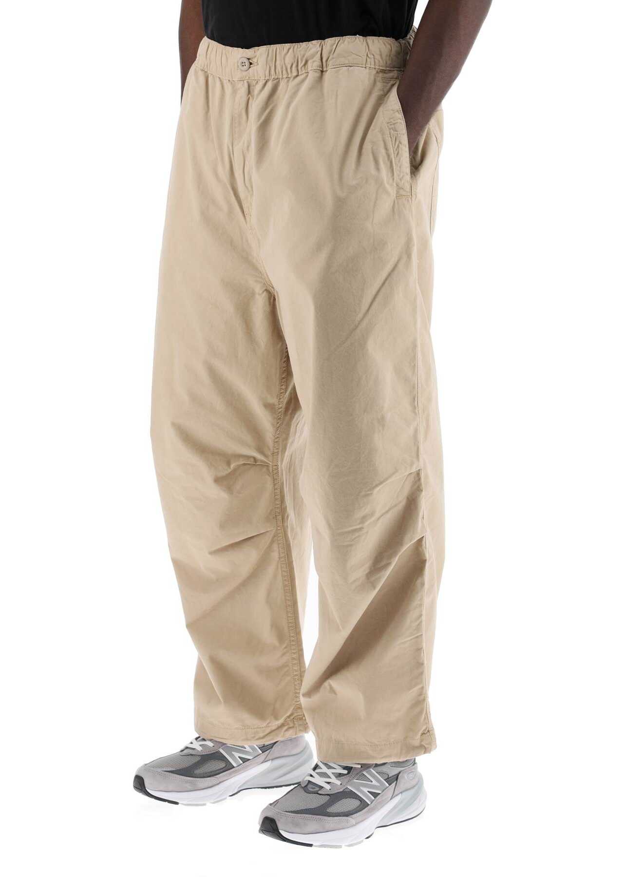 The Judd pants by Carhartt WIP are made of lightweight Dothan cotton poplin with a wide design enhanced by pleats on the knees for added volume. The model features two side welt pockets, two applied back pockets, an elasticated waistband, and a concealed zip fly with button closure. They are personalized with an iconic fabric logo patch on the back. The model is 187 cm tall and wears size L.
