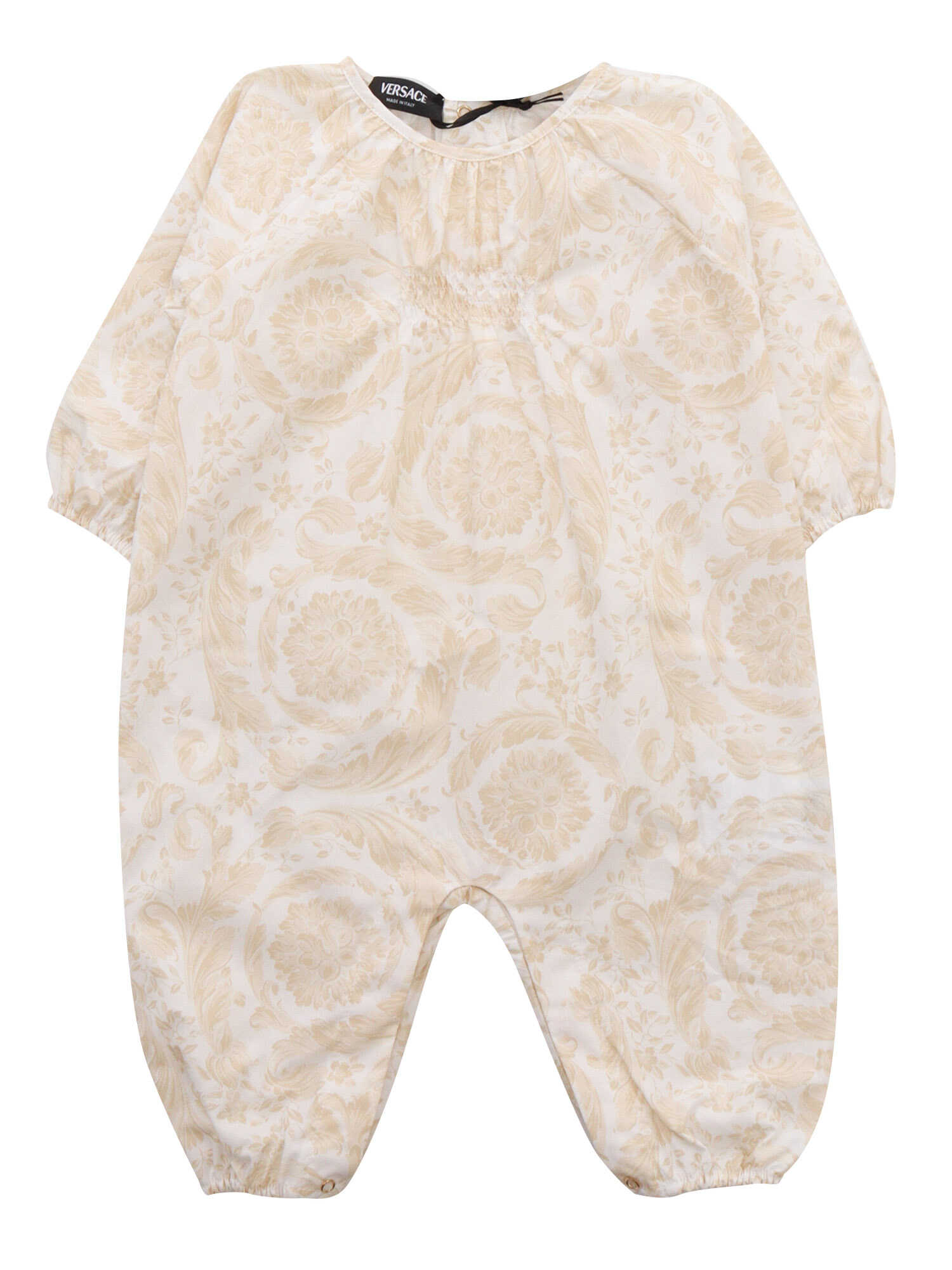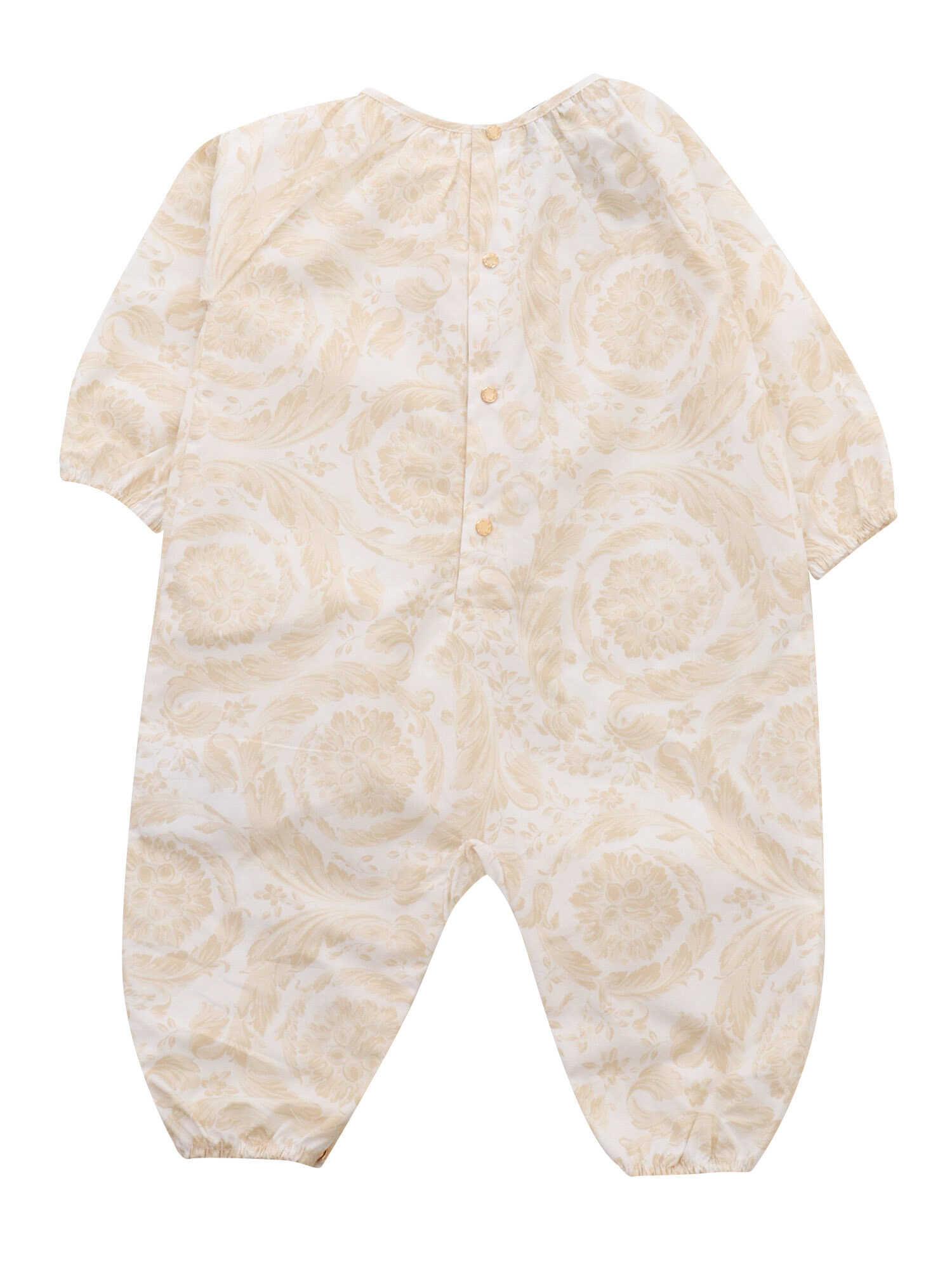 Baroque print playsuit in cotton poplin with long sleeves, without feet, crew neck, back buttons.