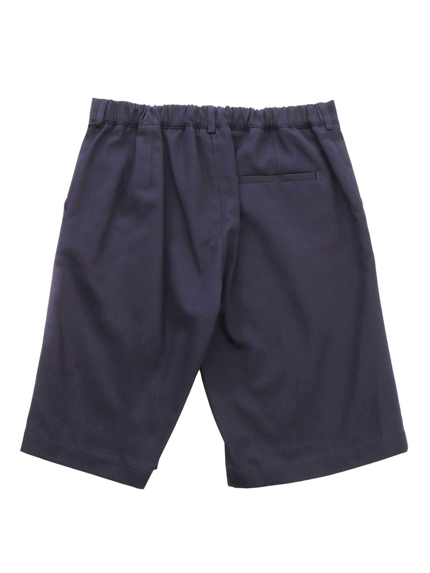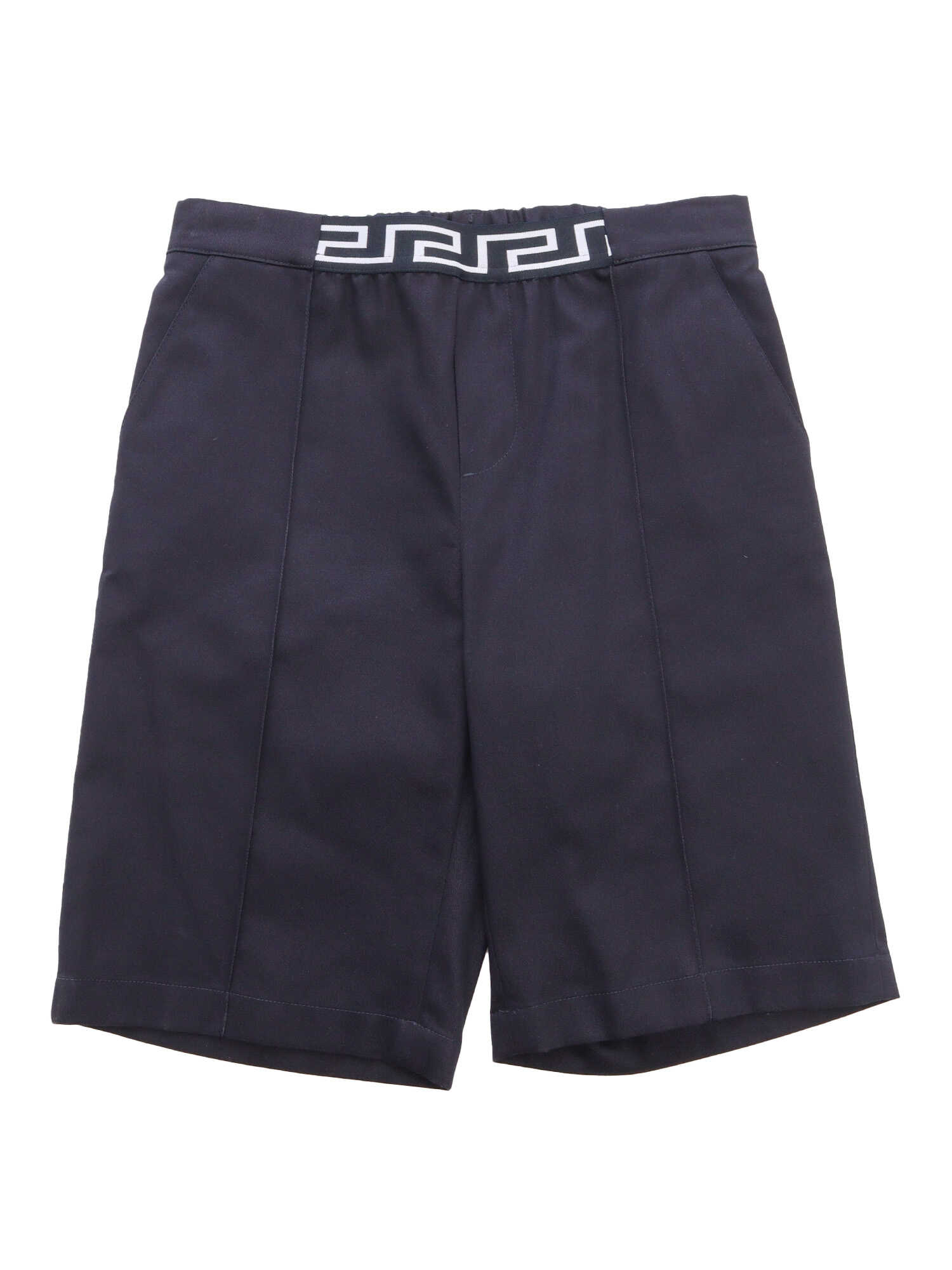Blue Versace logo print shorts in gabardine with welt pockets, elastic waistband.