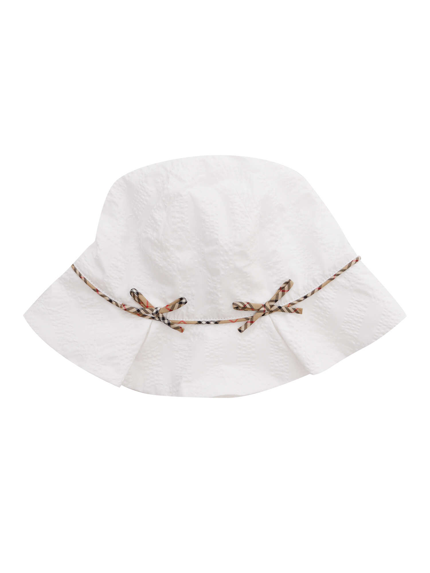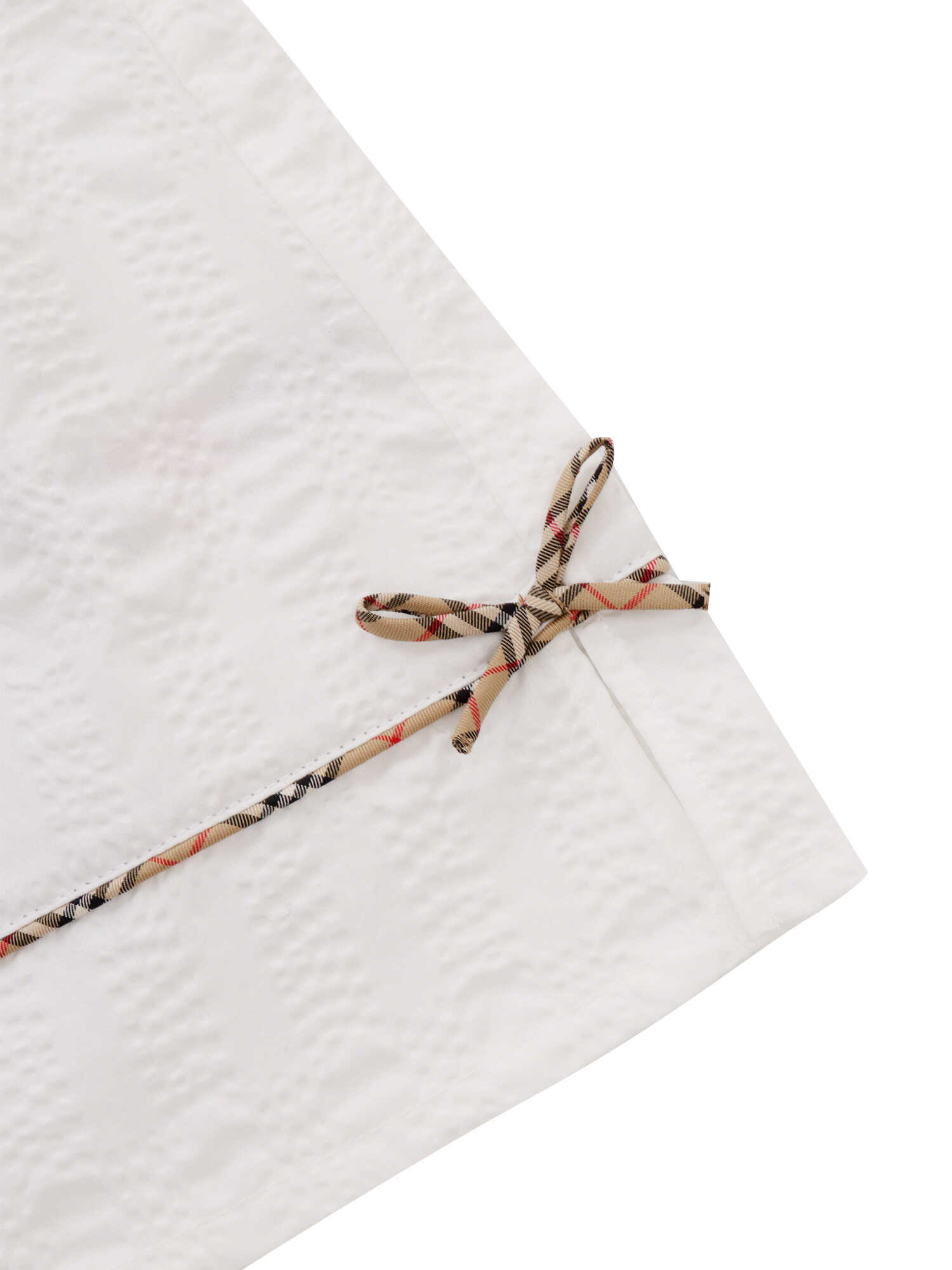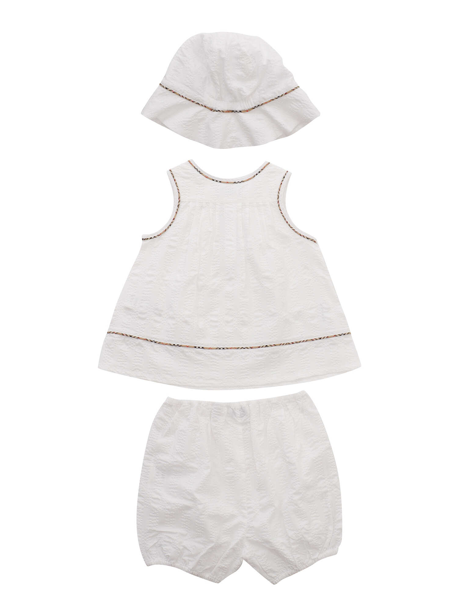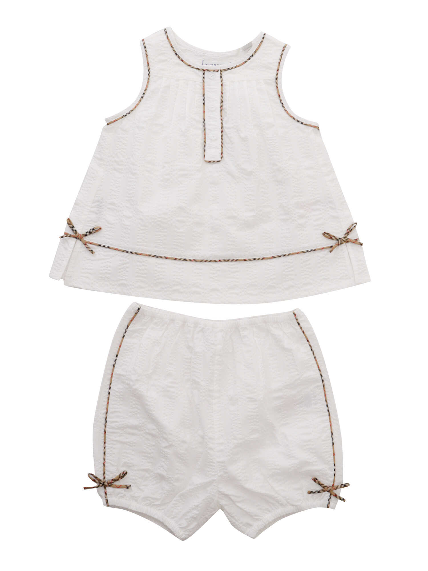 Burberry white short suit for children consisting of tank top, shorts, hat. All made in cotton, all-over contrasting embroidery with brand logo pattern.