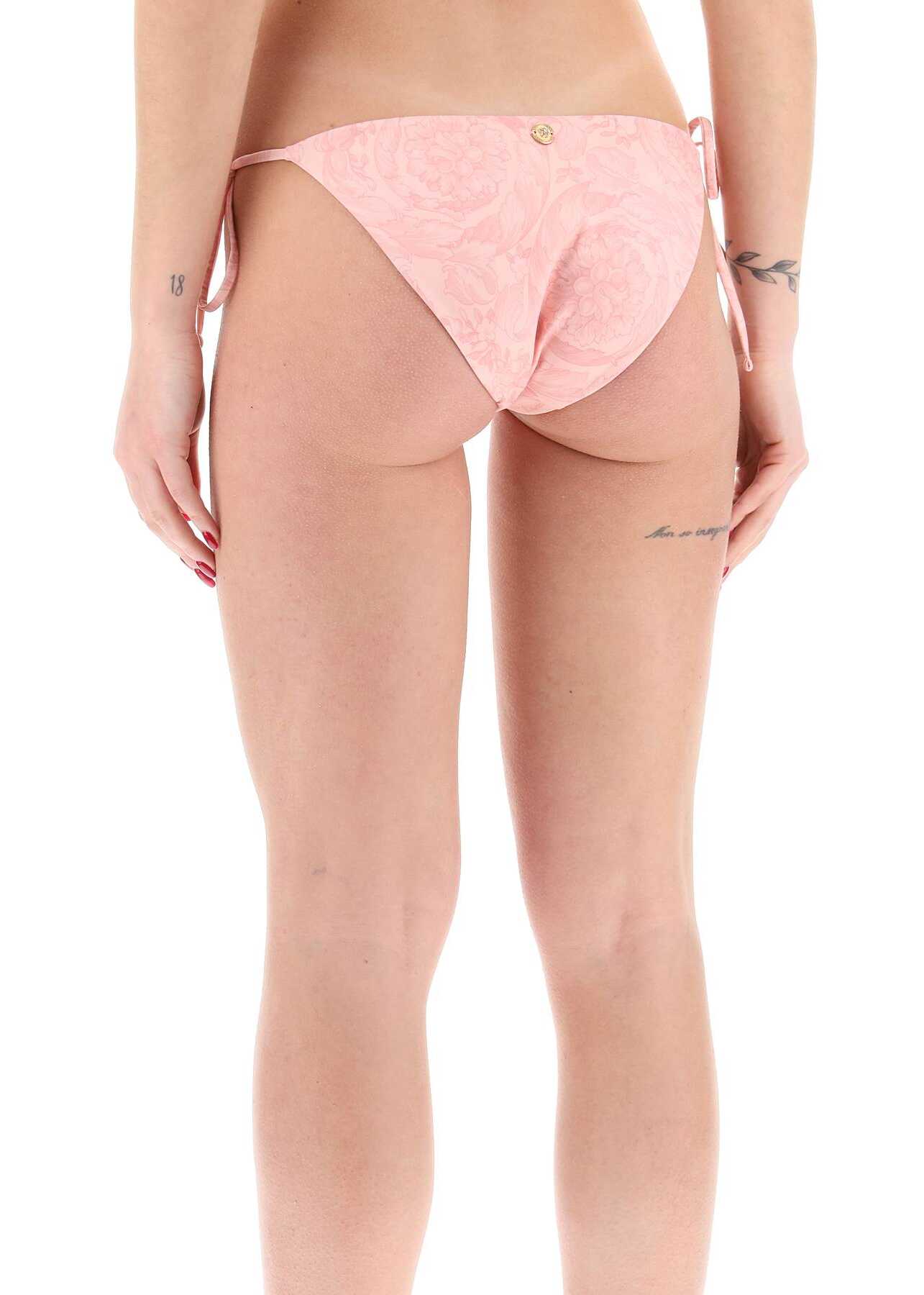 Versace bikini briefs made of lycra with a Baroque pattern printed all over. It features a closure with knotable strings. Lined and embellished with a golden metal Medusa logo. The model is 177 cm tall and wears a size 2.