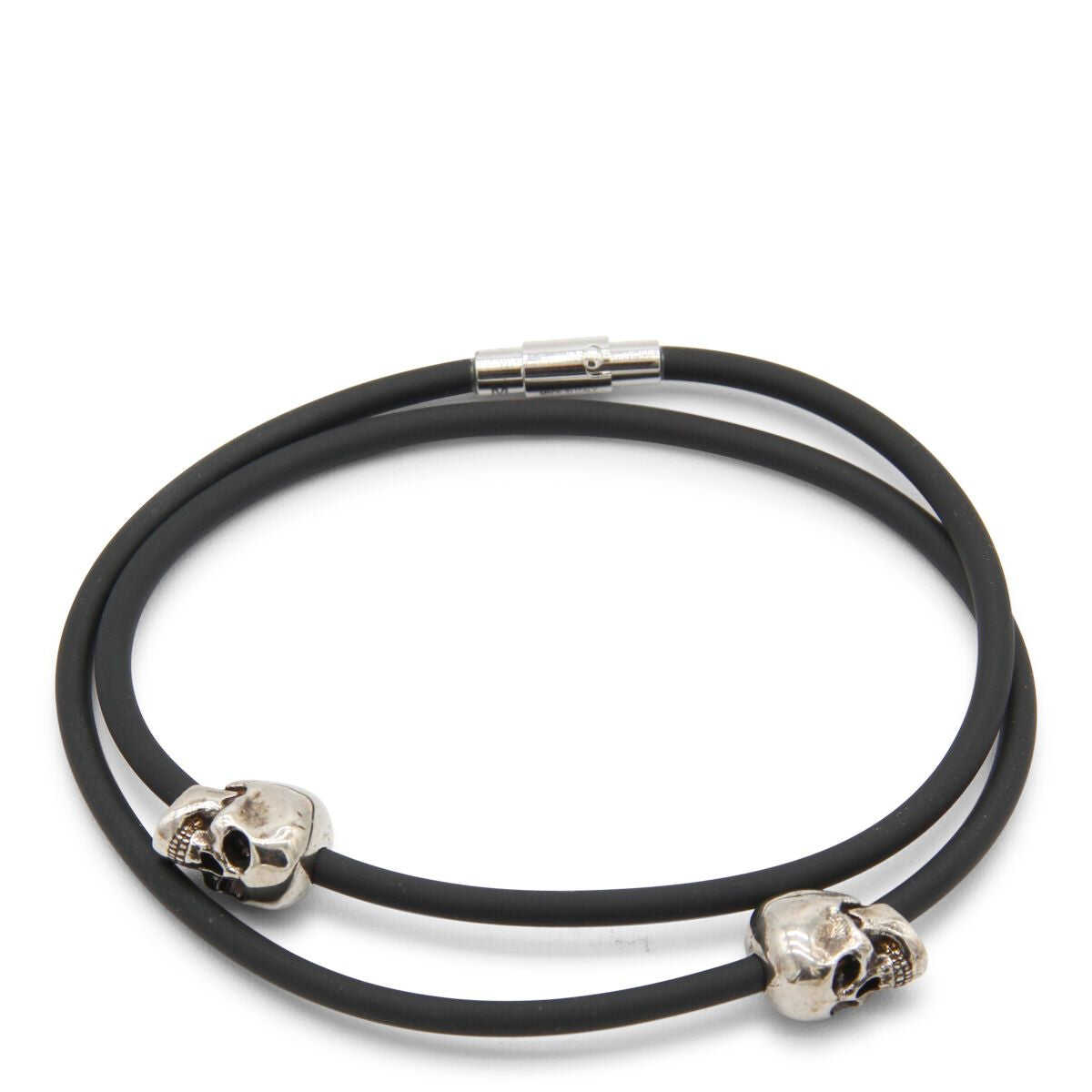 double-layered cord bracelet from Alexander McQueen featuring black, silver-tone hardware, engraved logo, skull charm, cord band and double layer.