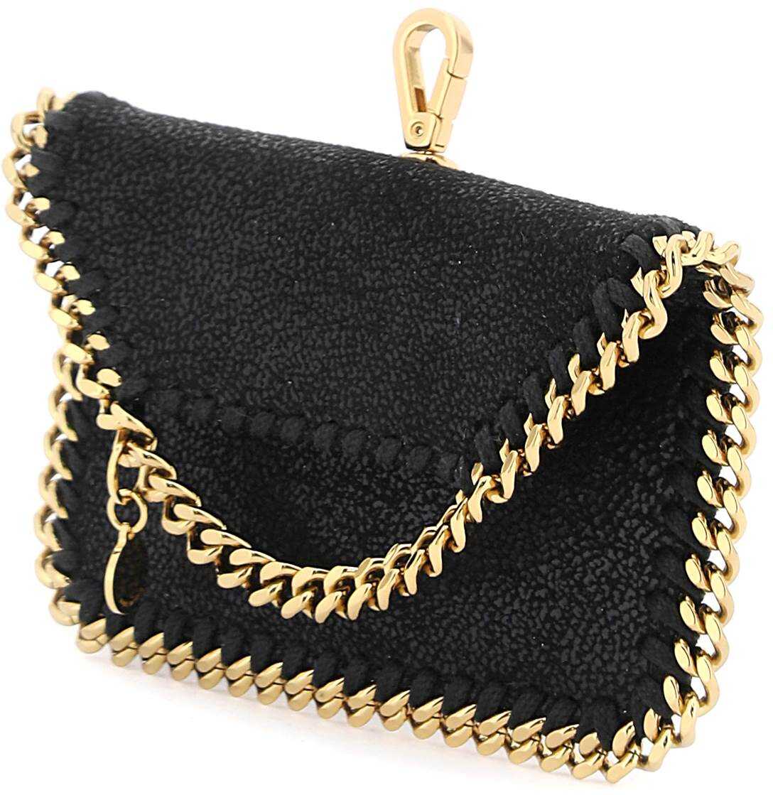 The Falabella credit card holder by Stella McCartney is made of Shaggy Deer material with an iconic gold chain applied on the edges and flap, along with a charm featuring an engraved logo. It has a snap button closure, lined interior, and a back carabiner clip.
