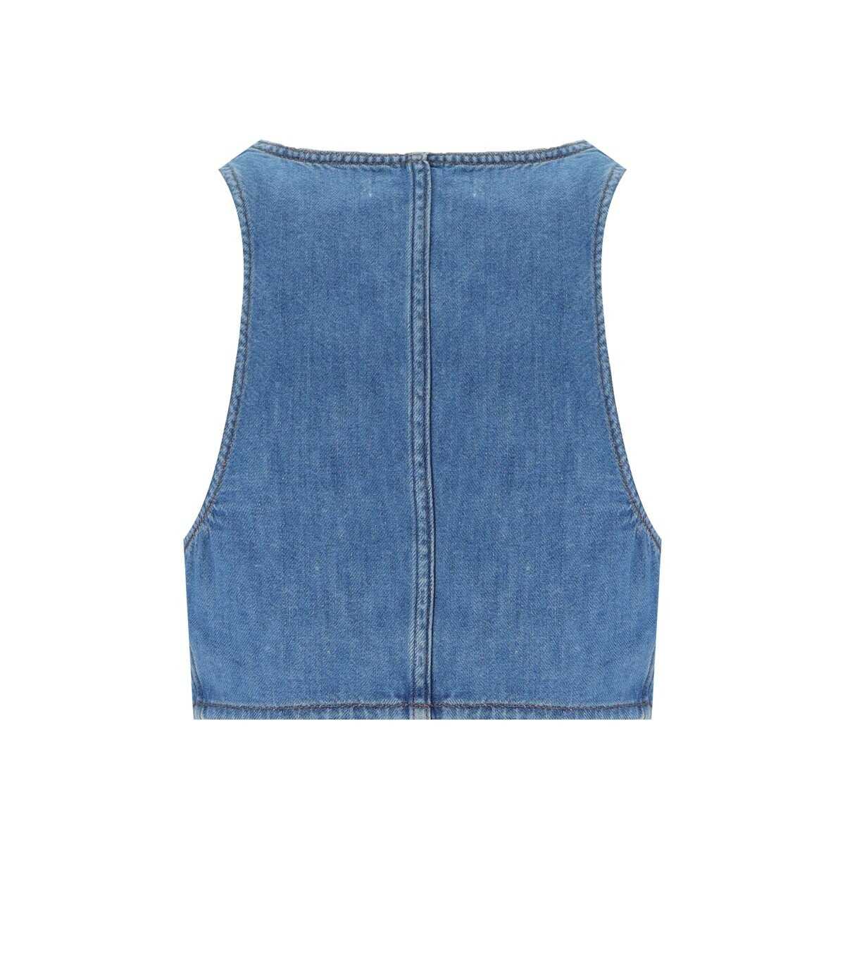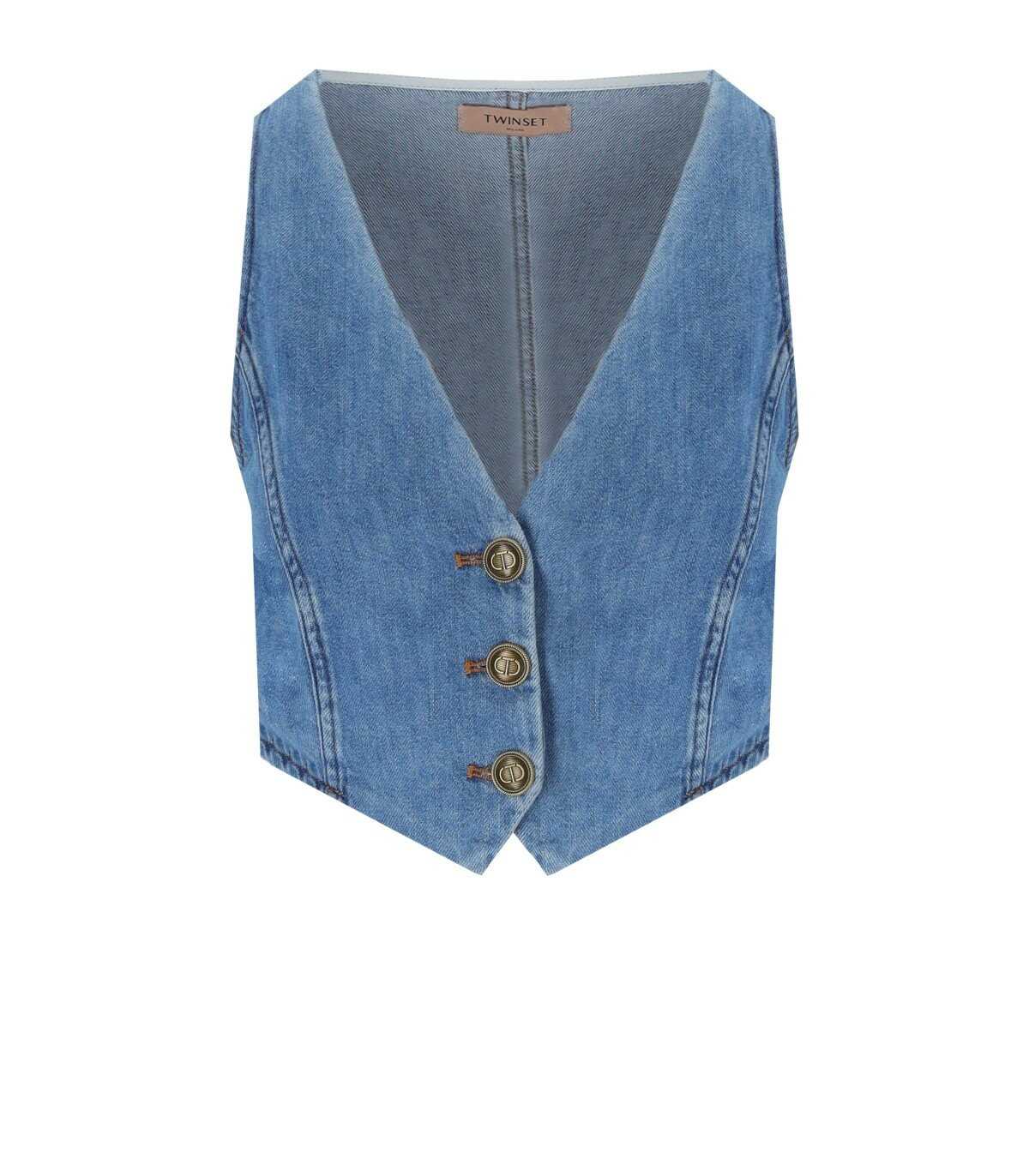 Twinset denim vest made of medium blue cotton. V-neck, button closure with logo. Loose fit.