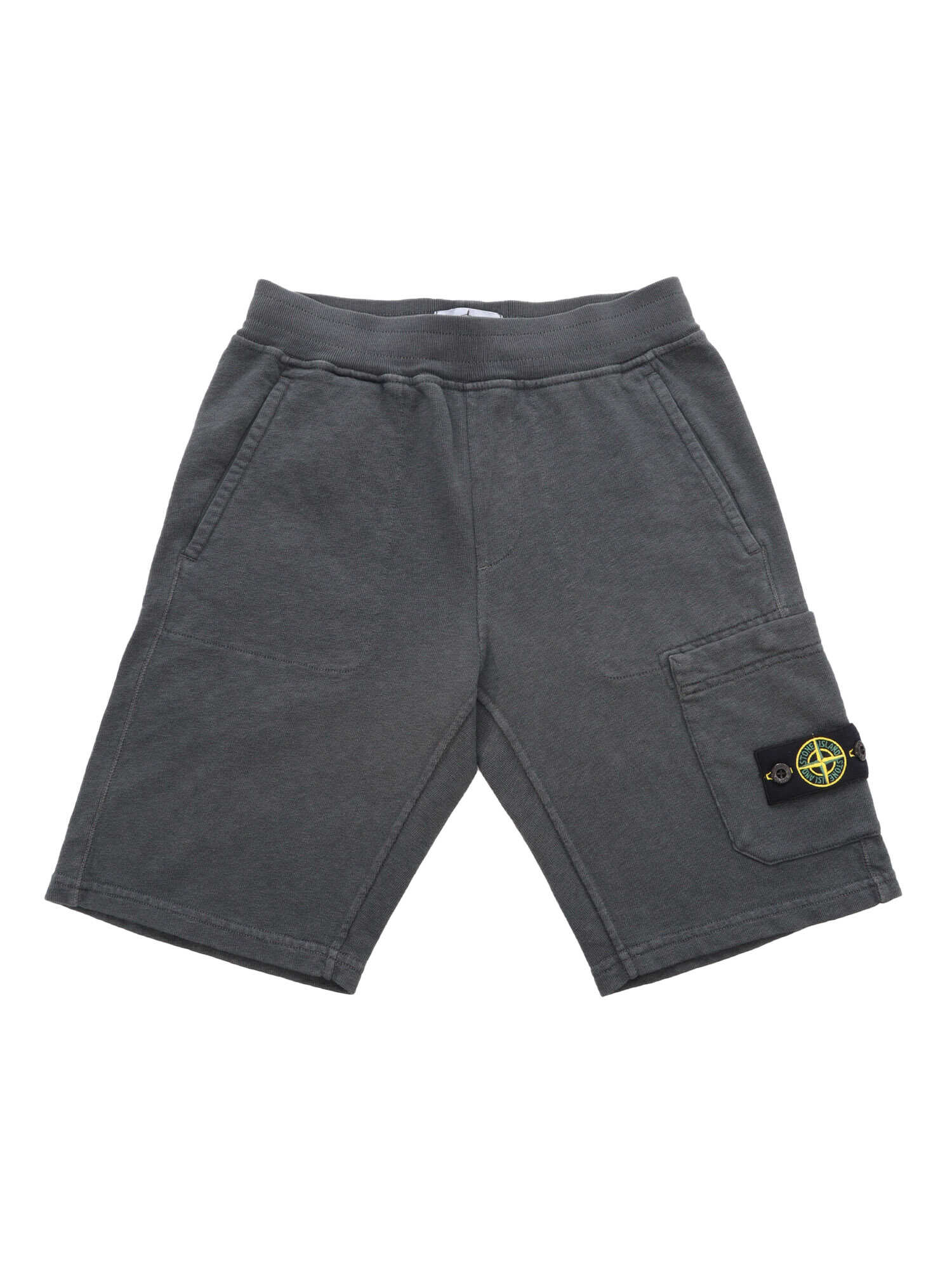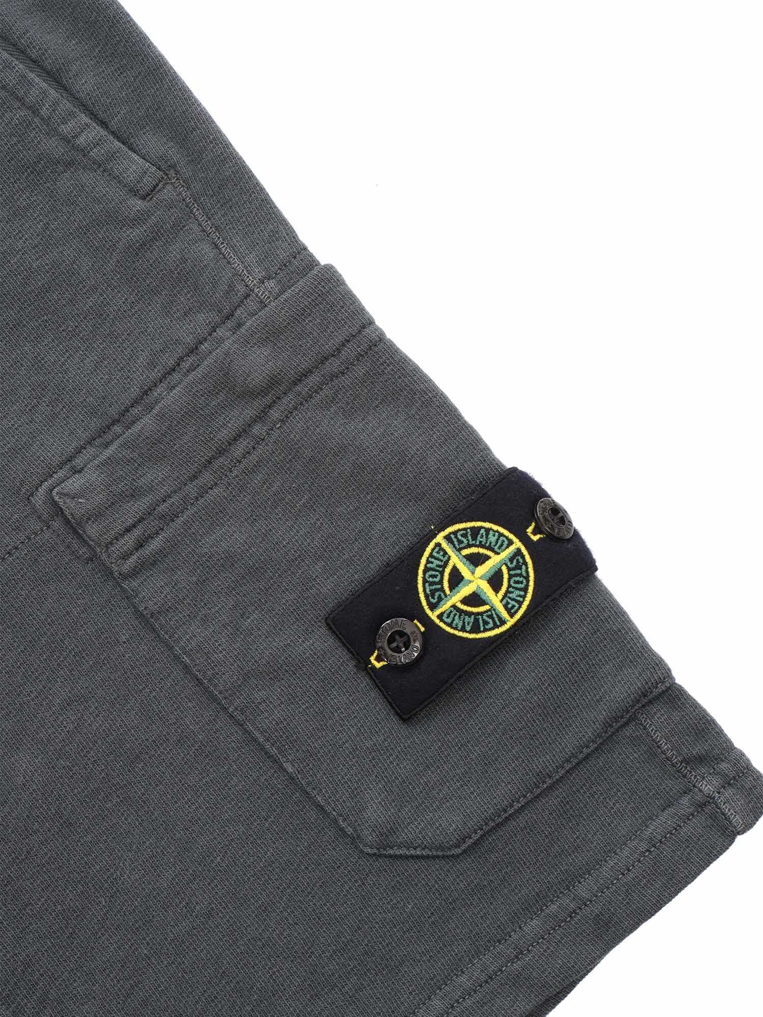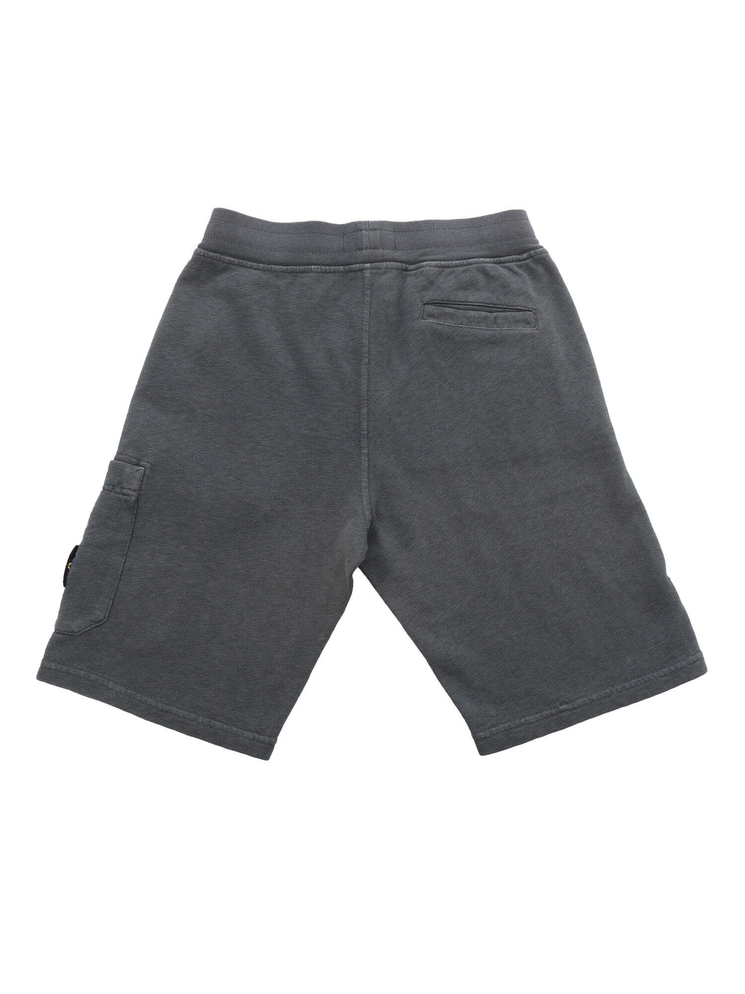 Gray fleece Bermuda shorts for children, large welt pockets, contrasting logo plate, small back pocket.