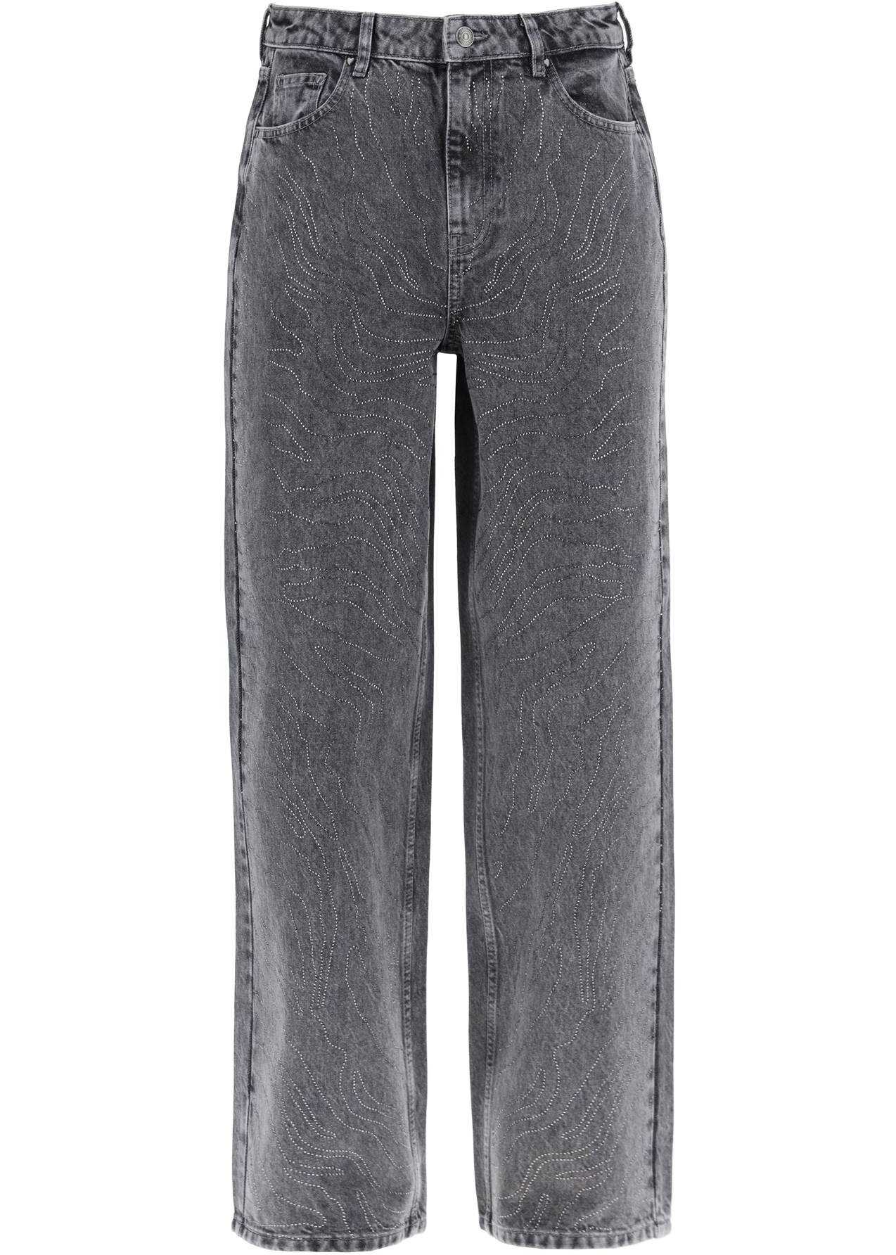 Rotate jeans made of pure certified cotton denim embellished with rhinestones applied on the surface. Five-pocket design with belt loops and zip and button fly, featuring a low-rise fit and wide leg. The model is 177 cm tall and wears size 26.