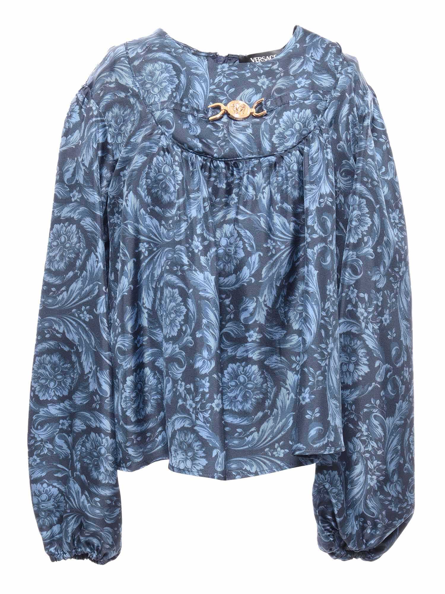 Baroque style girl's silk shirt, loose fit, long sleeves, back zip, gold-plated logo medal on the front.