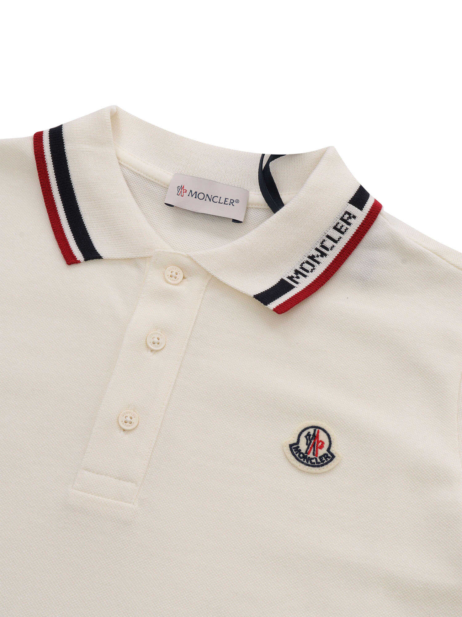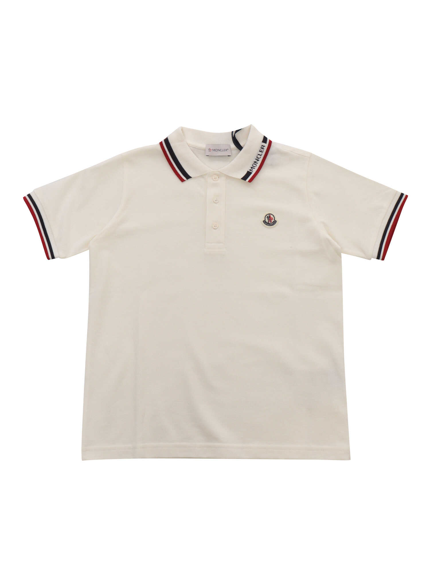 White cotton polo shirt with logo plate on the front, colored striped hems, small buttons on the front.