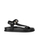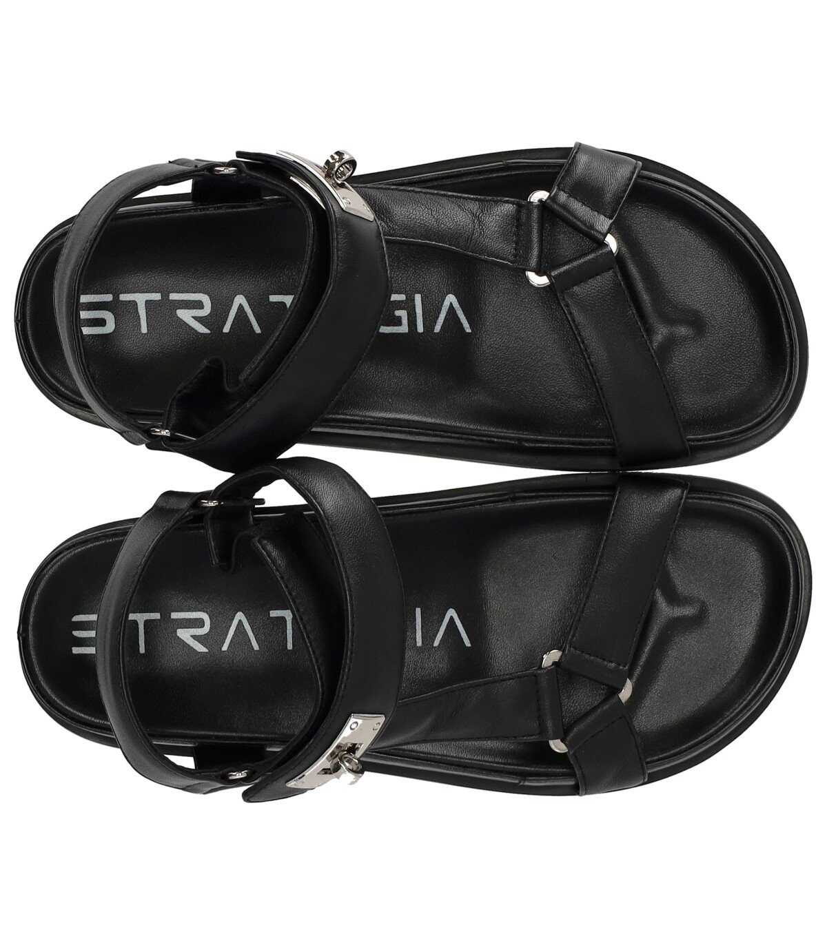 Strategia sandal made of soft black leather, strap with snap closure, contrasting logo insole, and rubber sole. Height 3 cm.
