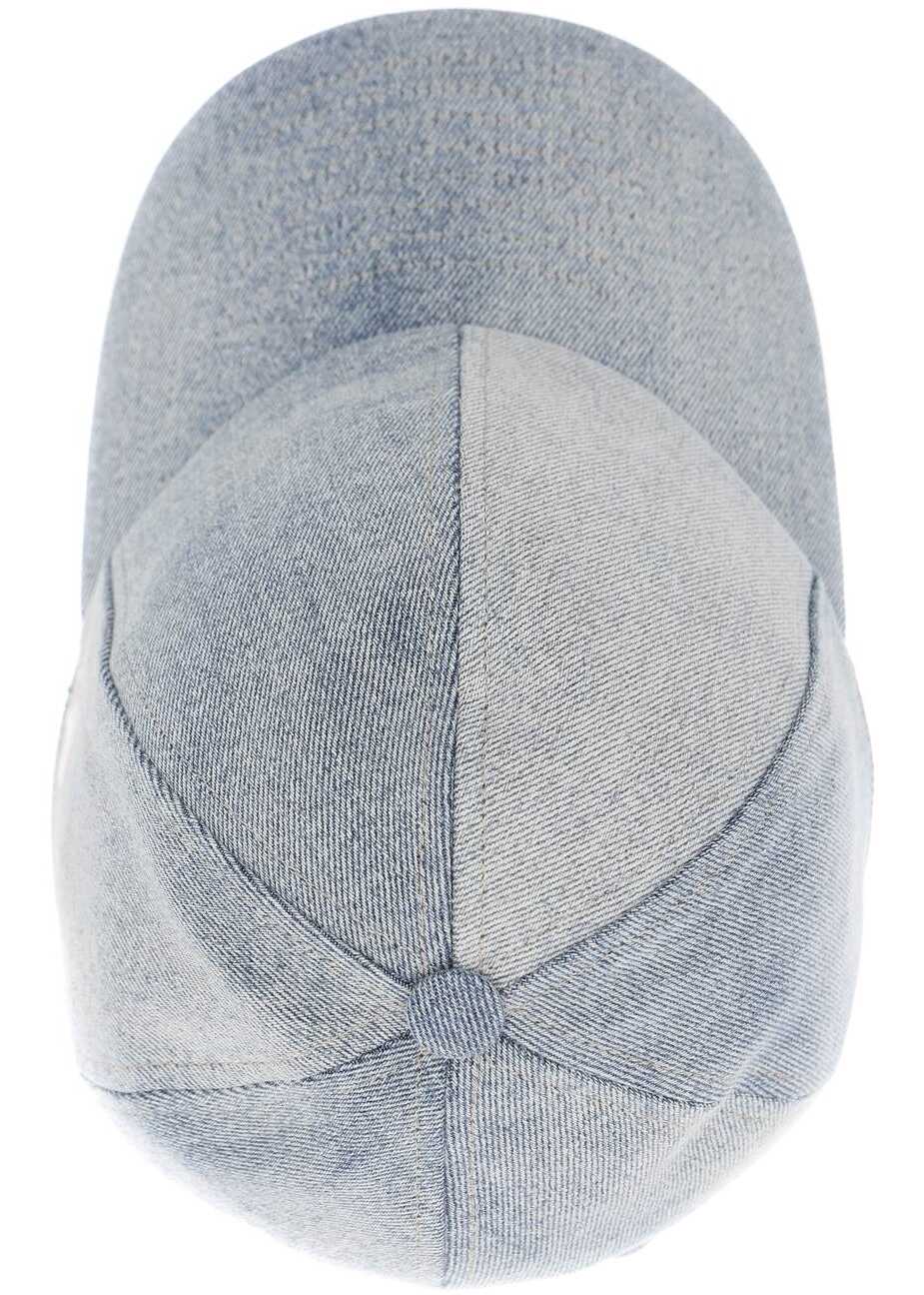 This Courrè ges baseball cap is made of light wash cotton denim and decorated with a contrasting embroidered monogram on the side. It features a stitched visor, adjustable strap at the back, and a lined interior. The item in the photo corresponds to size S.