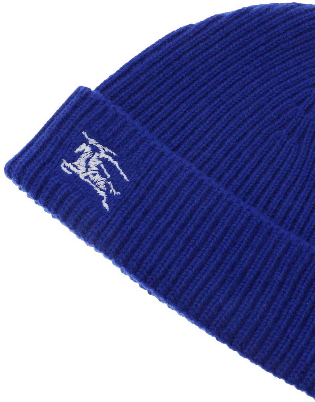 Burberry beanie hat crafted in ribbed pure cashmere knit, with turn-up hem embellished with contrasting EKD embroidery on the front. One size.