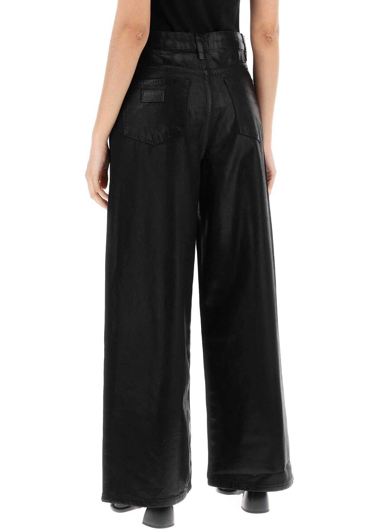 Ganni's five-pocket jeans model made of organic cotton denim and featuring a laminated tone finish. Hidden zip and button closure, logo patch applied on the back pocket, medium waist and relaxed fit with wide leg. The model is 177 cm tall and wears size 26.