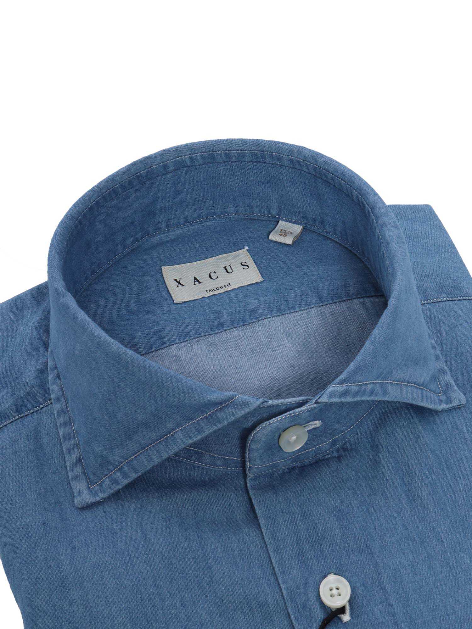 Xacus men's blue cotton shirt, classic collar, front buttons.