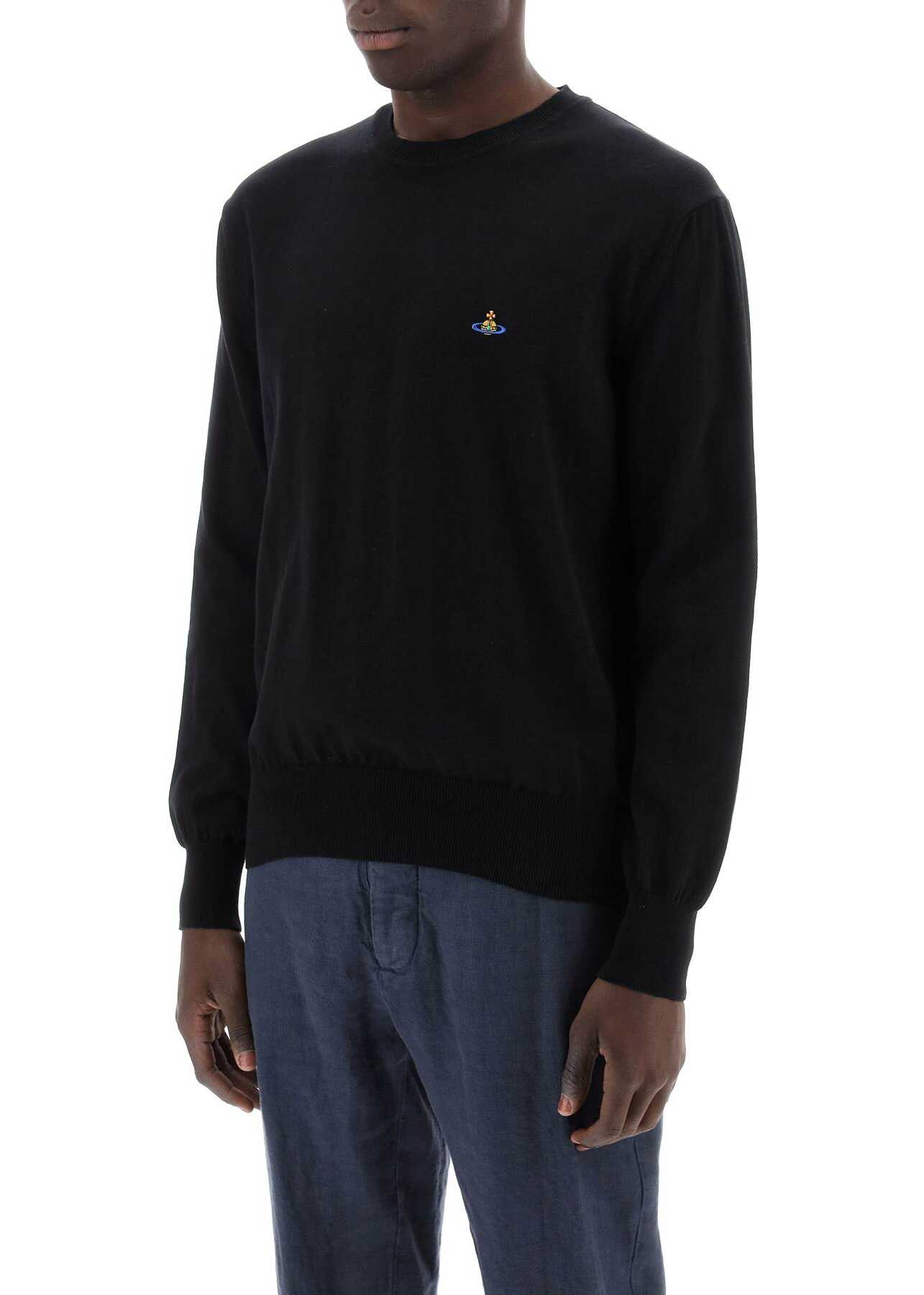 This classic Vivienne Westwood pullover features a crew neck design and is made from soft cotton yarn. It has a comfortable fit with slightly dropped armholes and ribbed edges. A small multicolored Orb logo is embroidered on the chest. The model is 187 cm tall and wears size L.