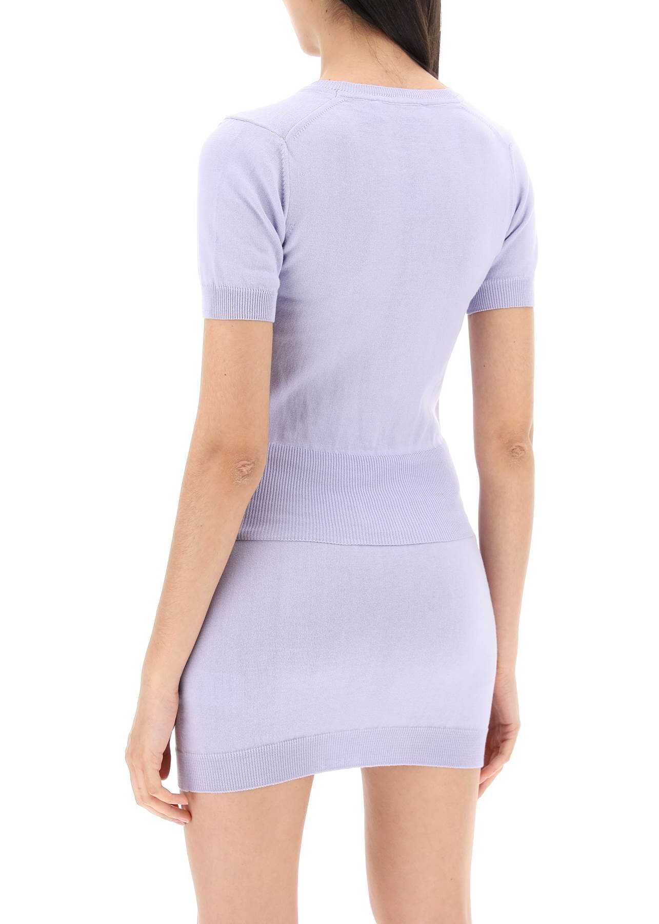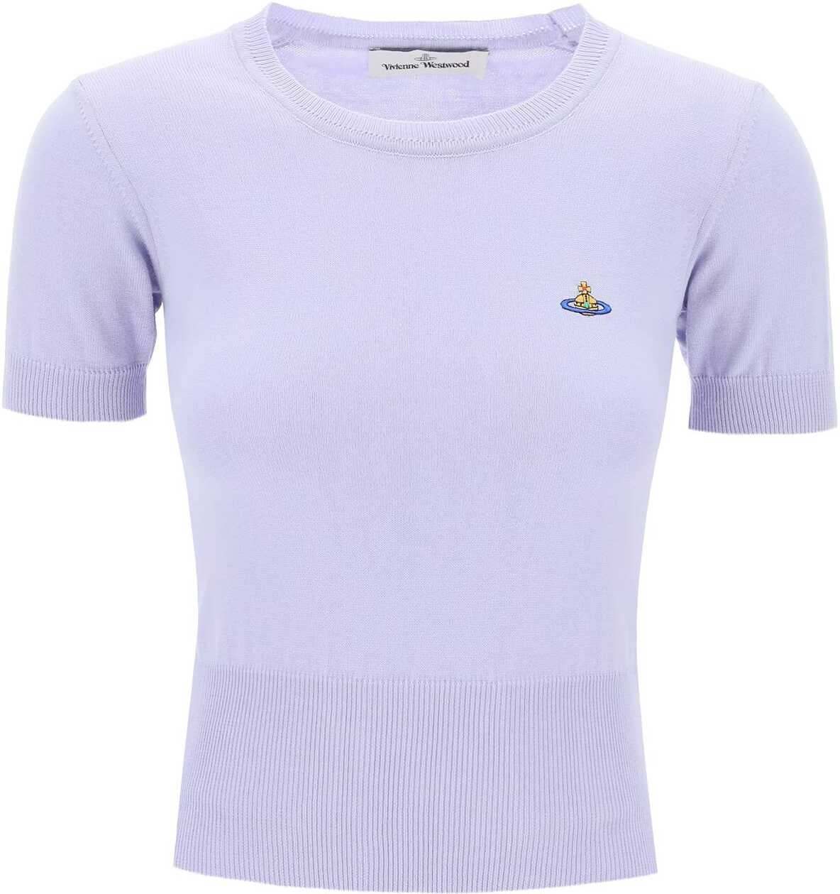 Vivienne Westwood Bea short-sleeved sweater in lightweight pure cotton knit, featuring the iconic Orb embroidery on the chest. Ribbed edges, slim fit. The model is 177 cm tall and wears a size XS.