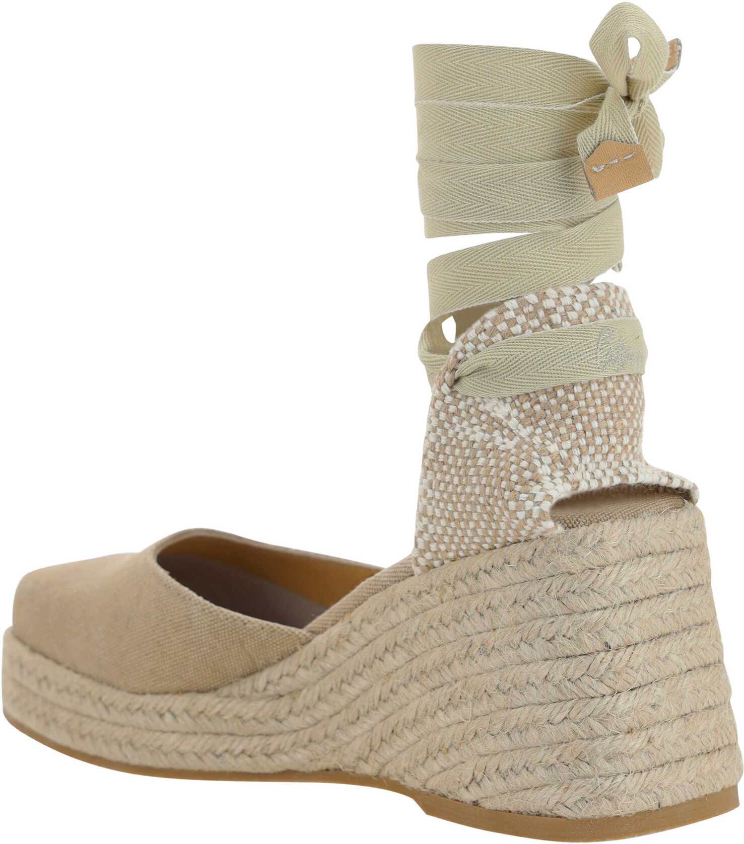 Cotton Tina Espadrilles Sandals by Castaner, featuring square toe, knotted sash around ankle, rope wedge heel, branded insole.