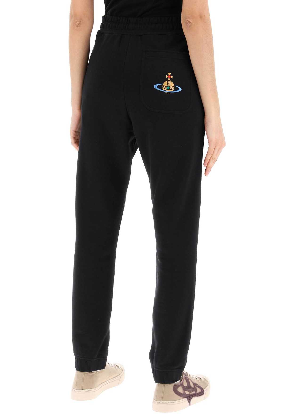 The Classic Jogger Pants by Vivienne Westwood are made of organic cotton jersey and feature a low crotch and branded drawstring at the waist. They have front French pockets, elasticated ankles, and a back pocket decorated with contrasting Orb embroidery. The model is 187 cm tall and wears size L. The model is 177 cm tall and wears size XS.