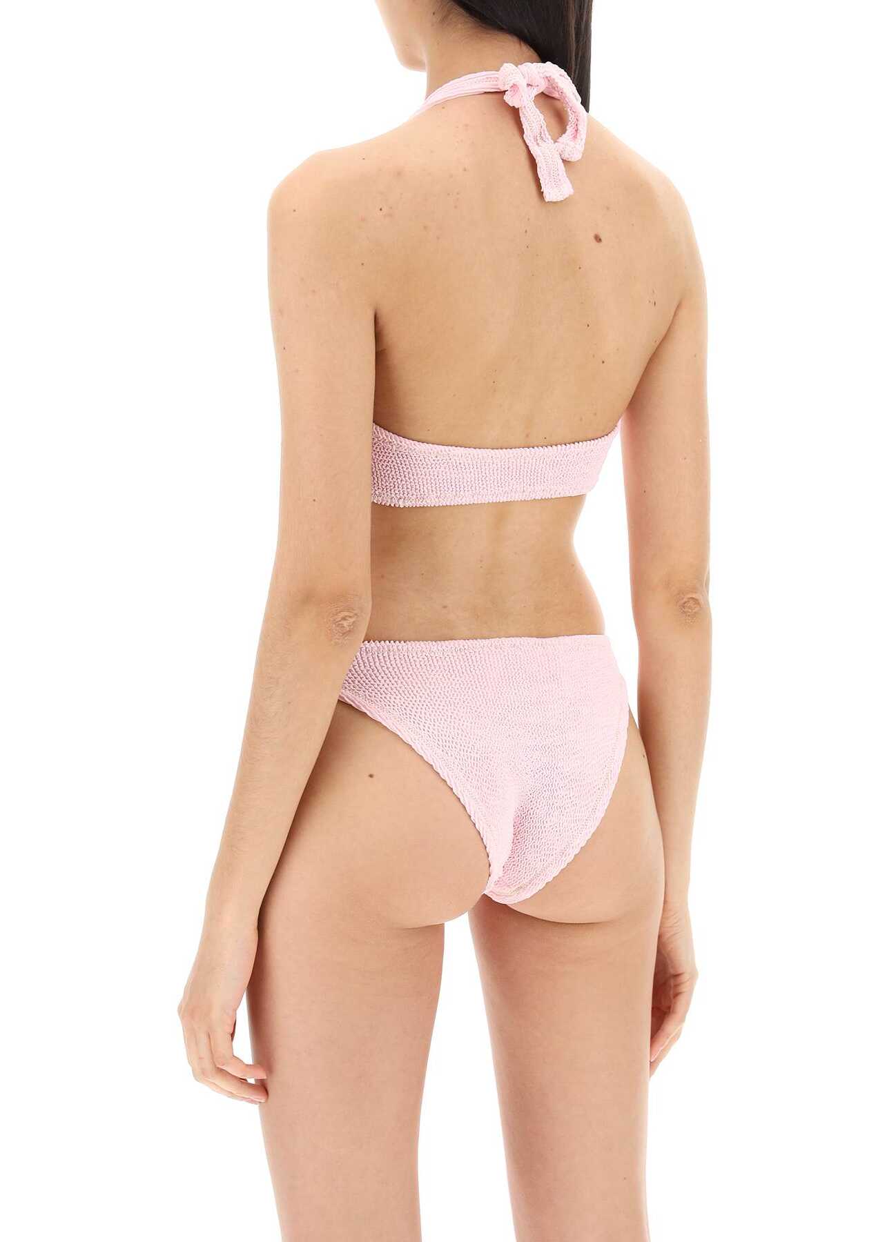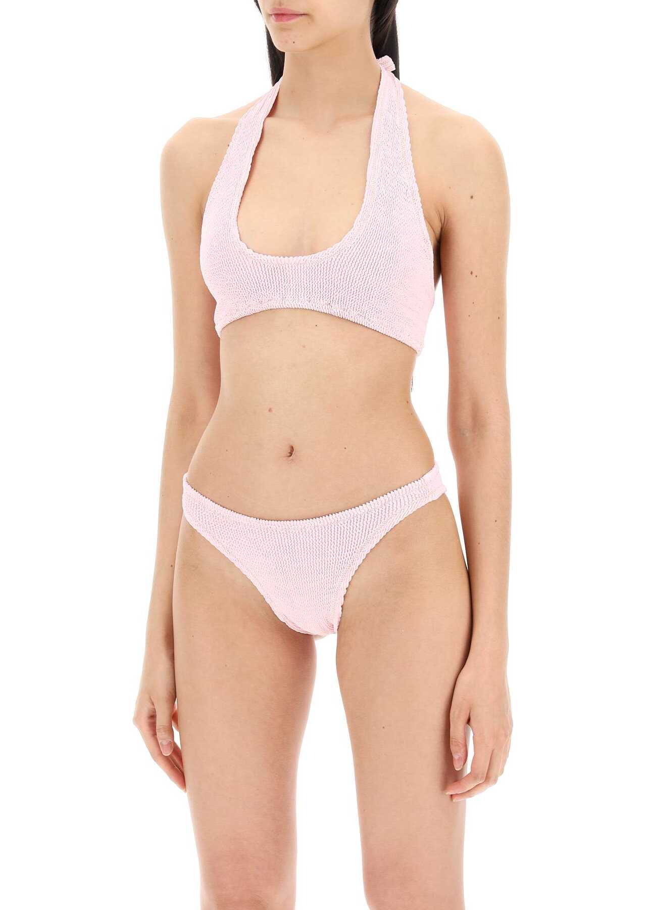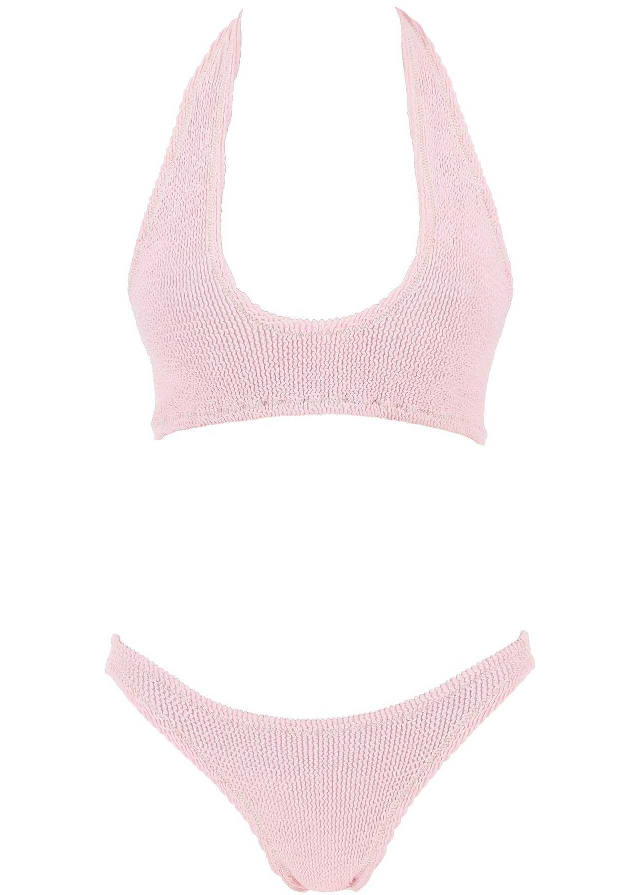 Bikini set in super stretch crinkle fabric by Reina Olga, composed of a top with large straps to tie behind the neck or criss-crossed on the back, and a bottom with adjustable coverage. Decorated with golden contrasting stitching. One size.