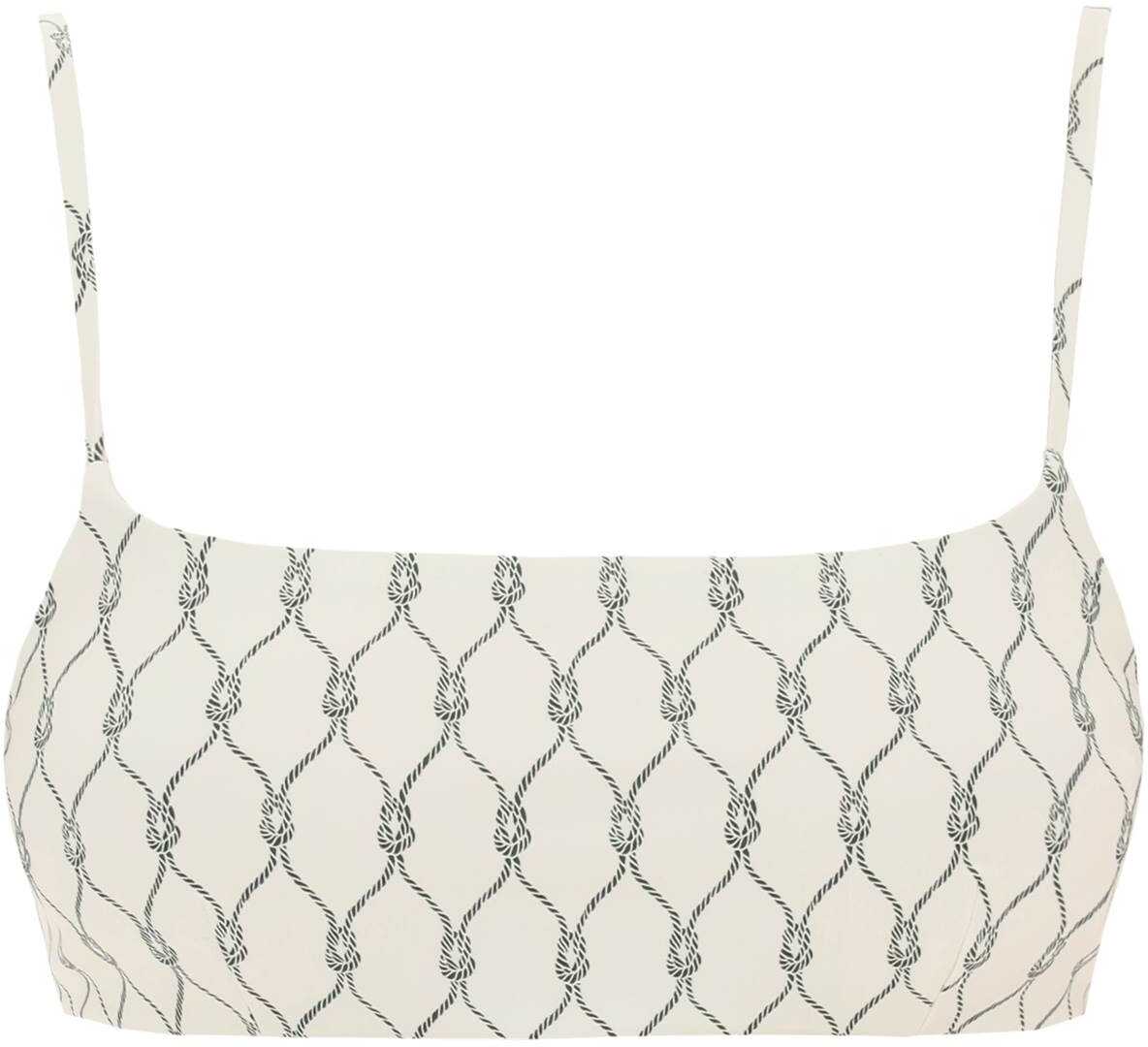 This top bikini by Tory Burch is made of printed Sensitive® fabric from Eurojersey, finished with adjustable straps and a hook closure on the back. The model is 177 cm tall and wears size S.