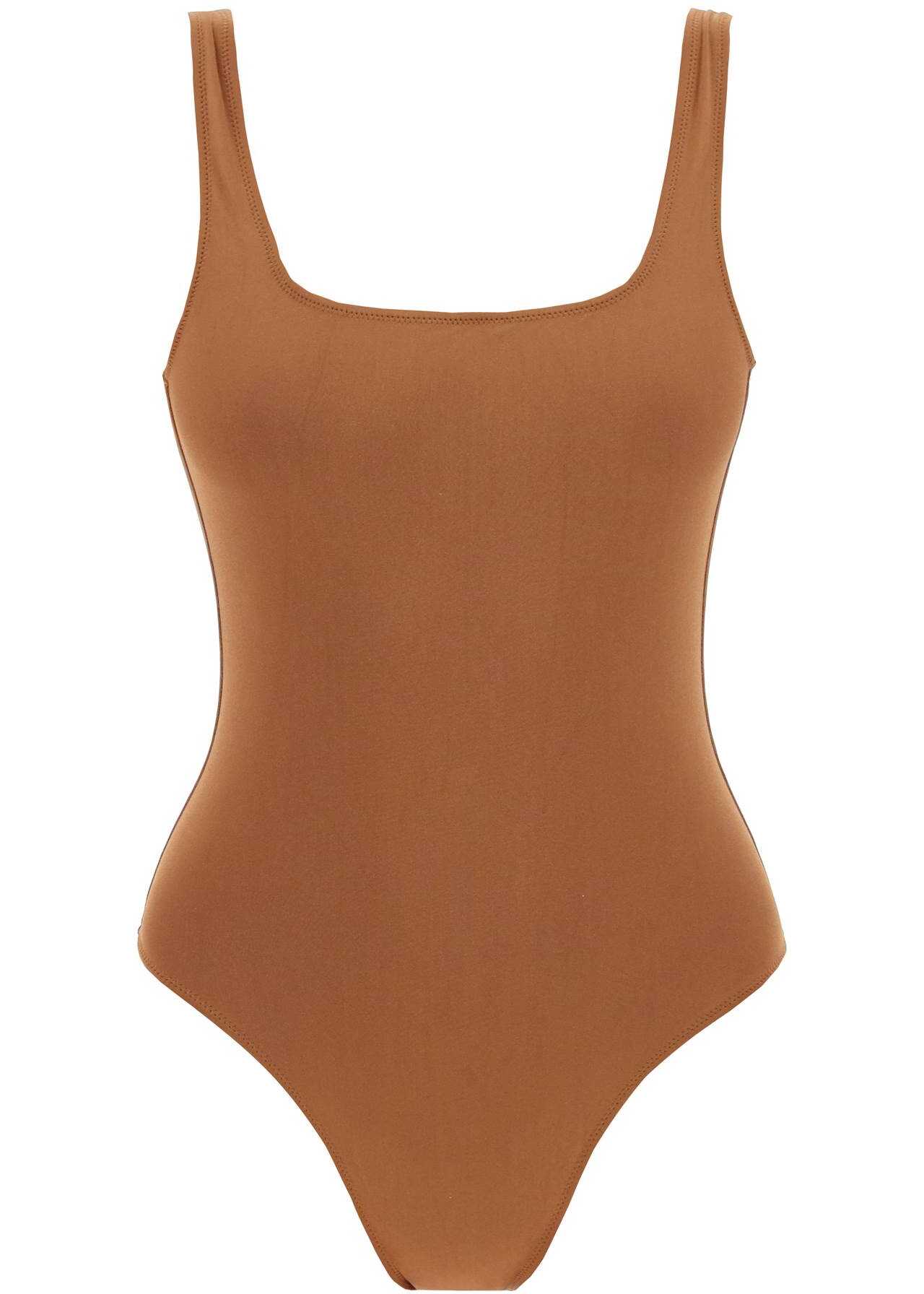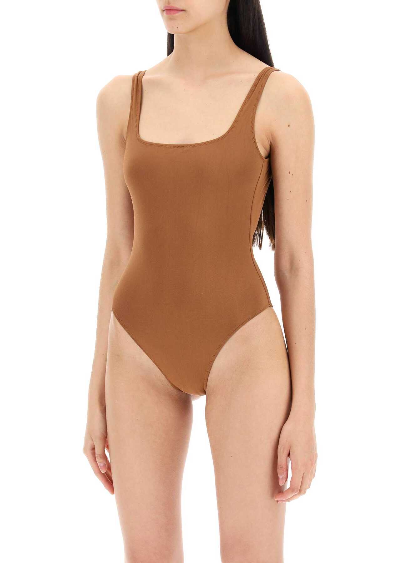 The Lido one-piece swimsuit is made of metallic lycra with a deep back neckline. The model is 177 cm tall and wears size XS.