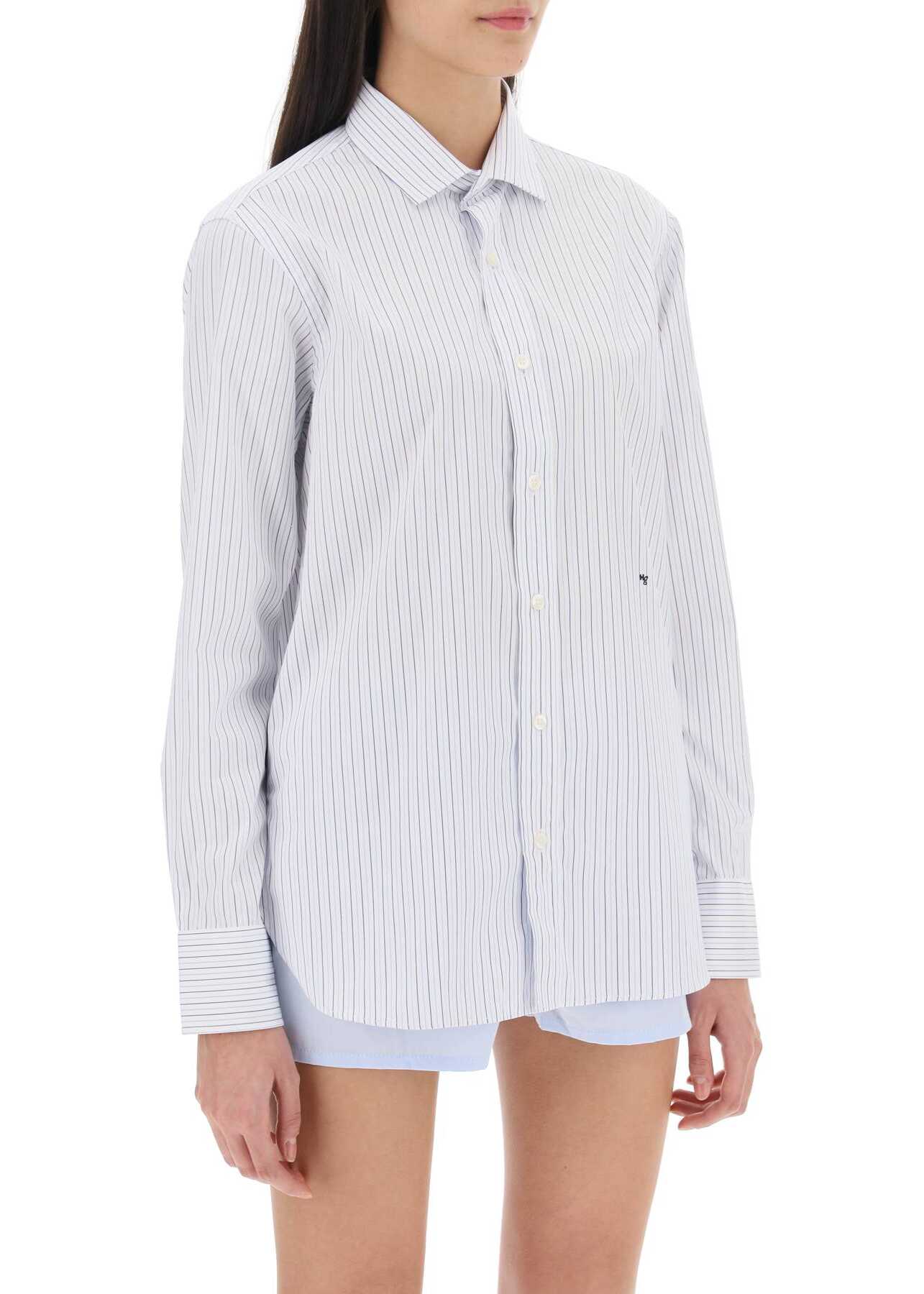 Hommegirls cotton poplin shirt embellished with an all-over striped pattern in two shades of blue. It features a classic button-up design complete with a spread collar, adjustable cuffs, curved hem, and box pleat at the back. Regular fit. The model is 177 cm tall and wears a size S.