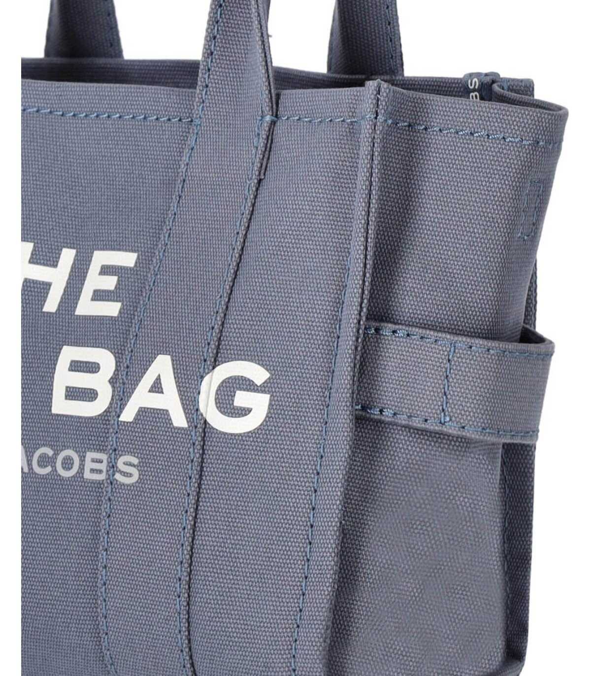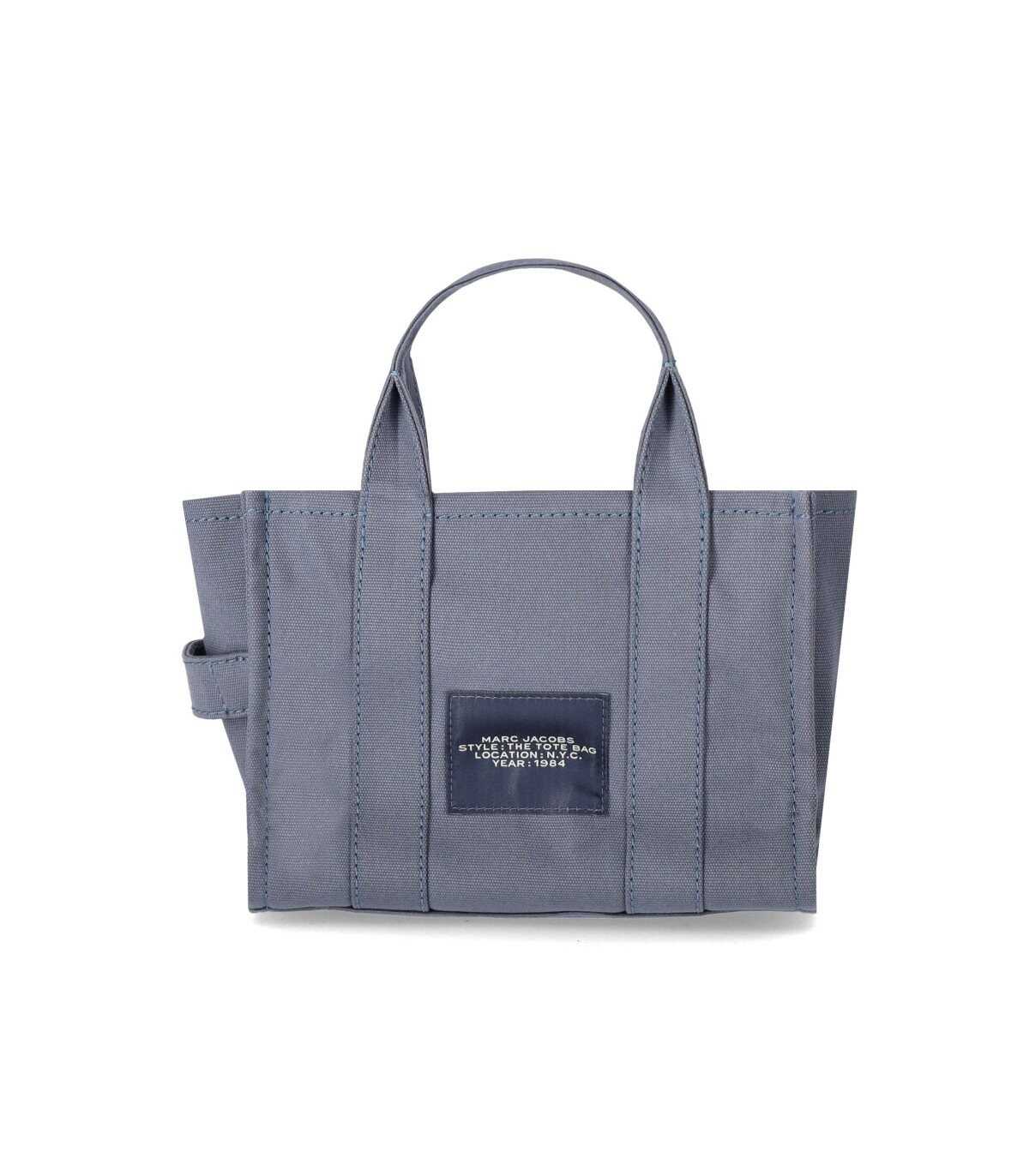 Marc Jacobs The Small Tote bag is made of cotton canvas in shades of blue with the iconic logo printed in contrast on the front. Unlined interior. Zip closure and adjustable and removable black fabric shoulder strap. Measures 26x13x21 cm.