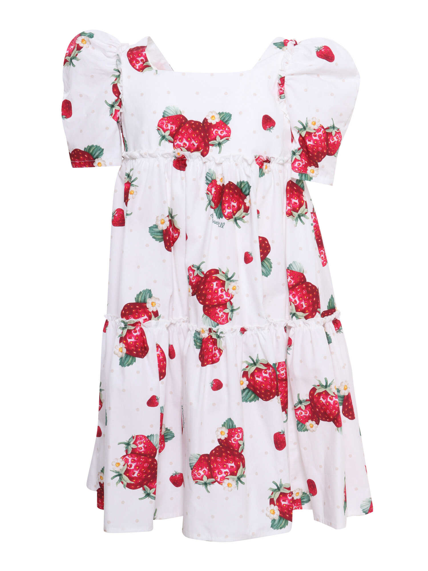 Ischia dress for girls in cotton with strawberry print, square neckline, short balloon sleeves, flounced skirt.