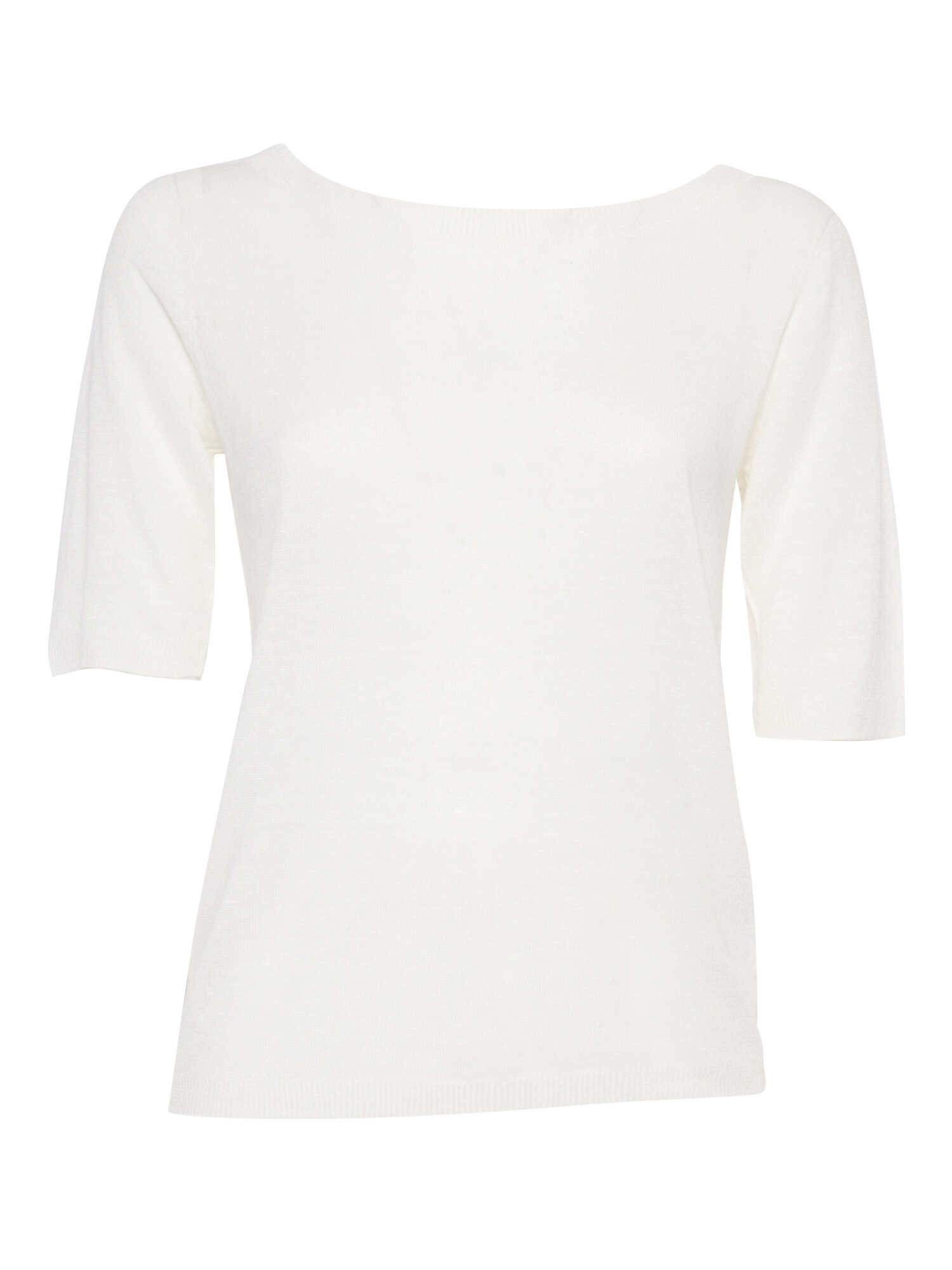 White linen sweater with wide boat neckline, 3/4 sleeves.