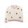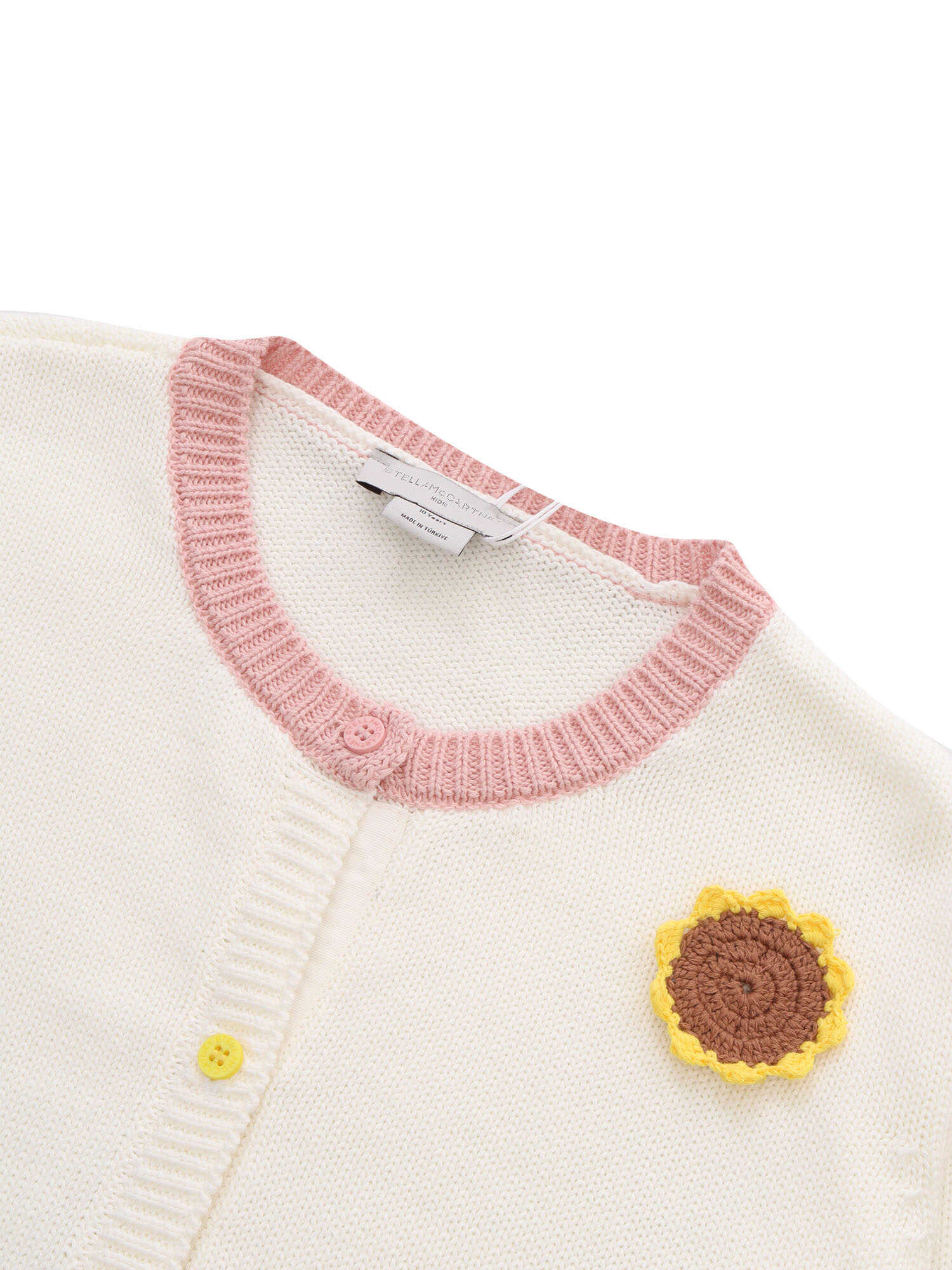 Knitted cardigan for girls with contrasting pink hems and collar, sunflowers applied all over in relief.