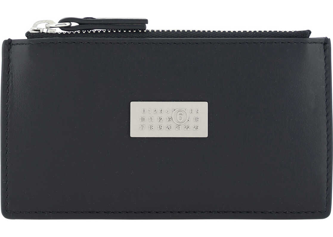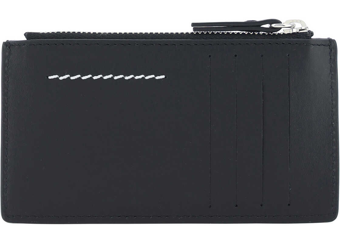 Calfskin Card Holder by MM6, coin compartment at top, card slot at back, iconic embroidered contrast stitching on back.