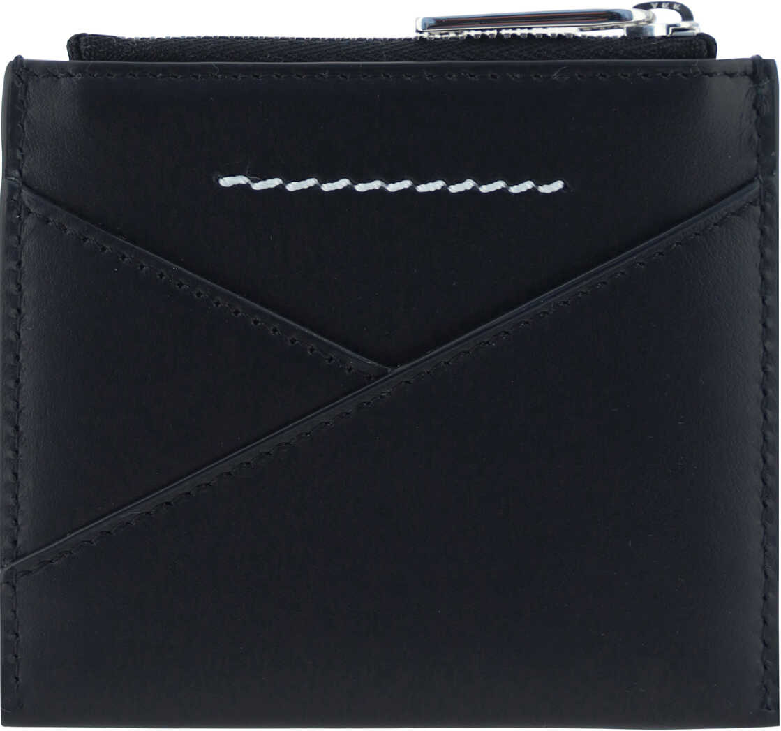 Calfskin Coin Purse by MM6, iconic brand monogram press-stamped on front, iconic brand stitching embroidered on back, top zipper closure.